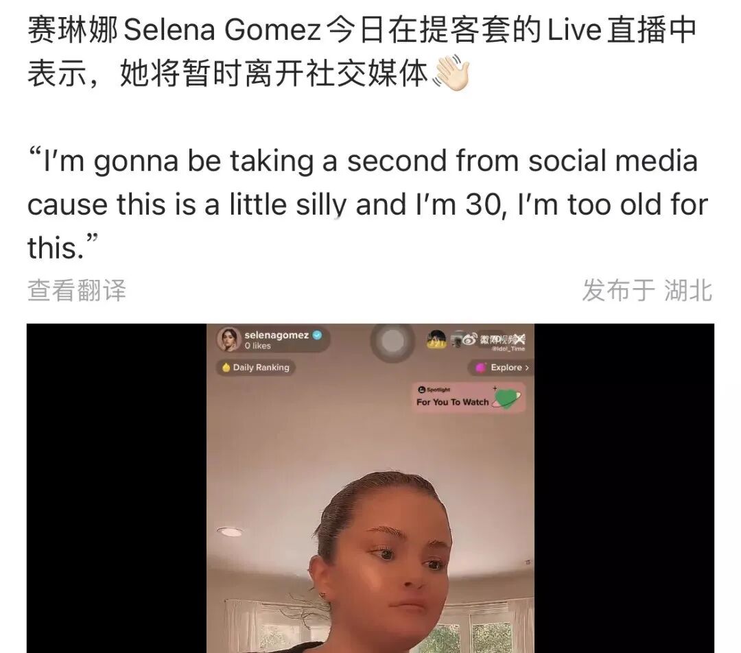 隨後賽琳娜表示最近網上輿論太乾擾自己了,所以選擇暫時退網。