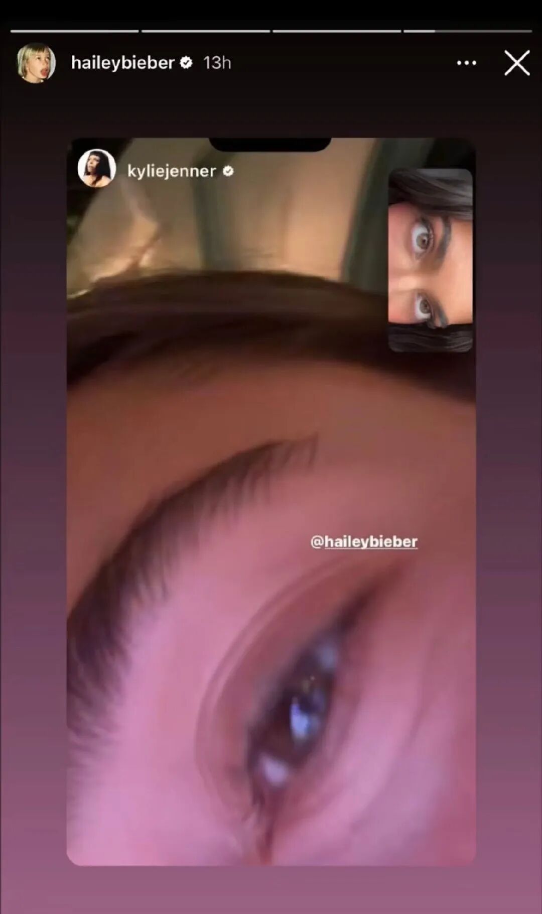 然後這條視頻發出三個小時後,卡戴珊家族的金小妹、也是當時ins上關注人數最多的人(目前已被賽琳娜反超)凱莉·詹娜發佈了一條和海莉的雙人視頻,視頻內容就是她們的眉毛,凱莉還艾特了海莉。