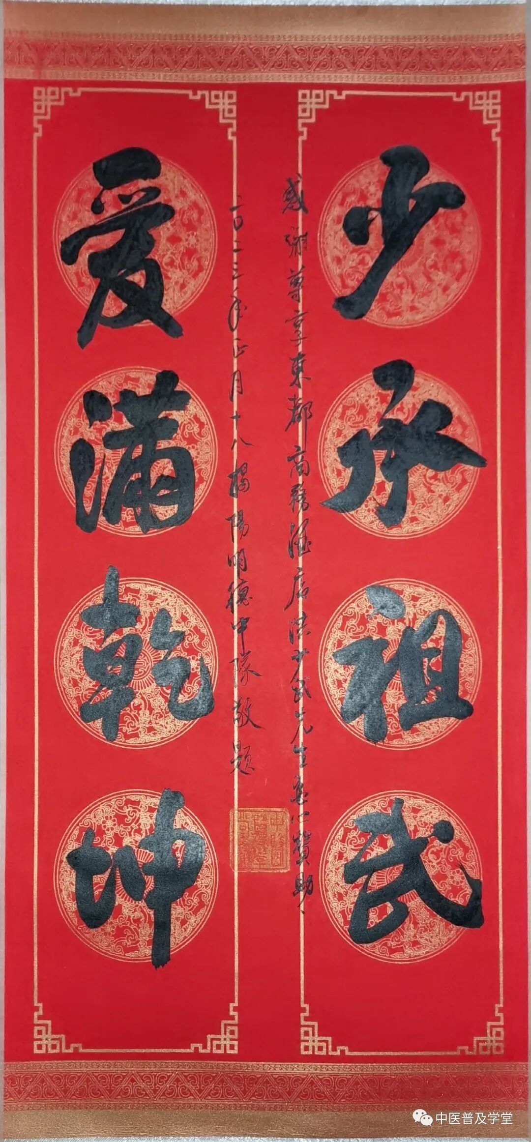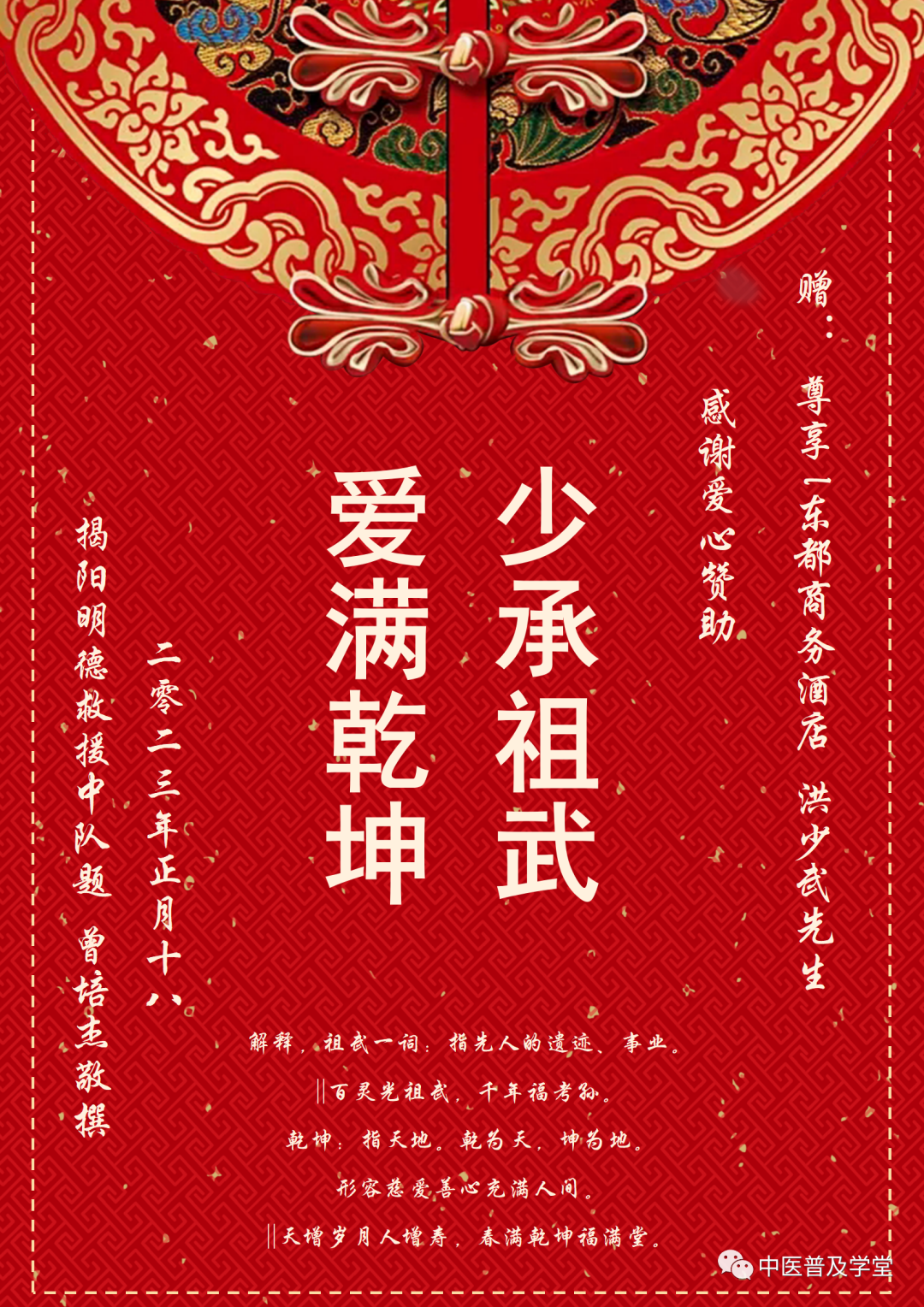 落款:感謝洪少武愛心捐助千元 癸卯年正月揭陽明德救援中隊題。嵌名聯詞語出處註解,祖武一詞:指先人的遺蹟、事業。武:足跡。||百靈光祖武,千年福考孫。