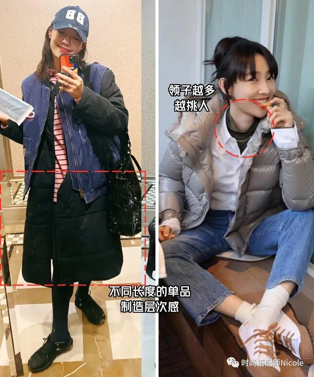 疊穿最忌諱的就是一樣的長度疊加,不管是領口還是下襬,都要選擇不同長度,領口儘量避免相同領型疊穿,脖子偏短的姐妹 ,疊穿不能超過兩層領子。