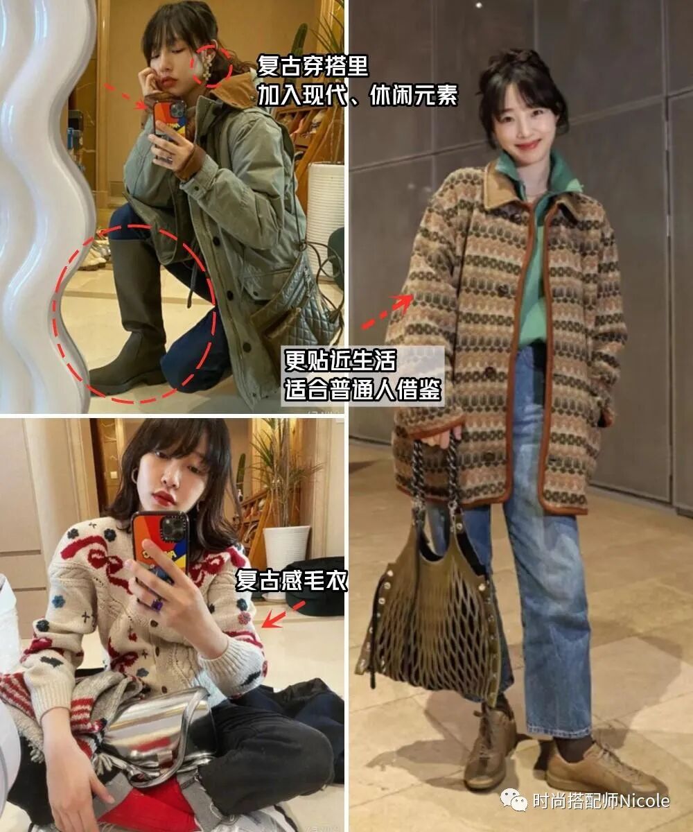 白百何絕對是vintage(古著)大戶,她的穿搭裡始終貫穿著充滿年代感的毛衣、美式復古夾克,不是單純復刻年代感穿搭,而是用混搭的方法打造出自己的風格“記憶點”。