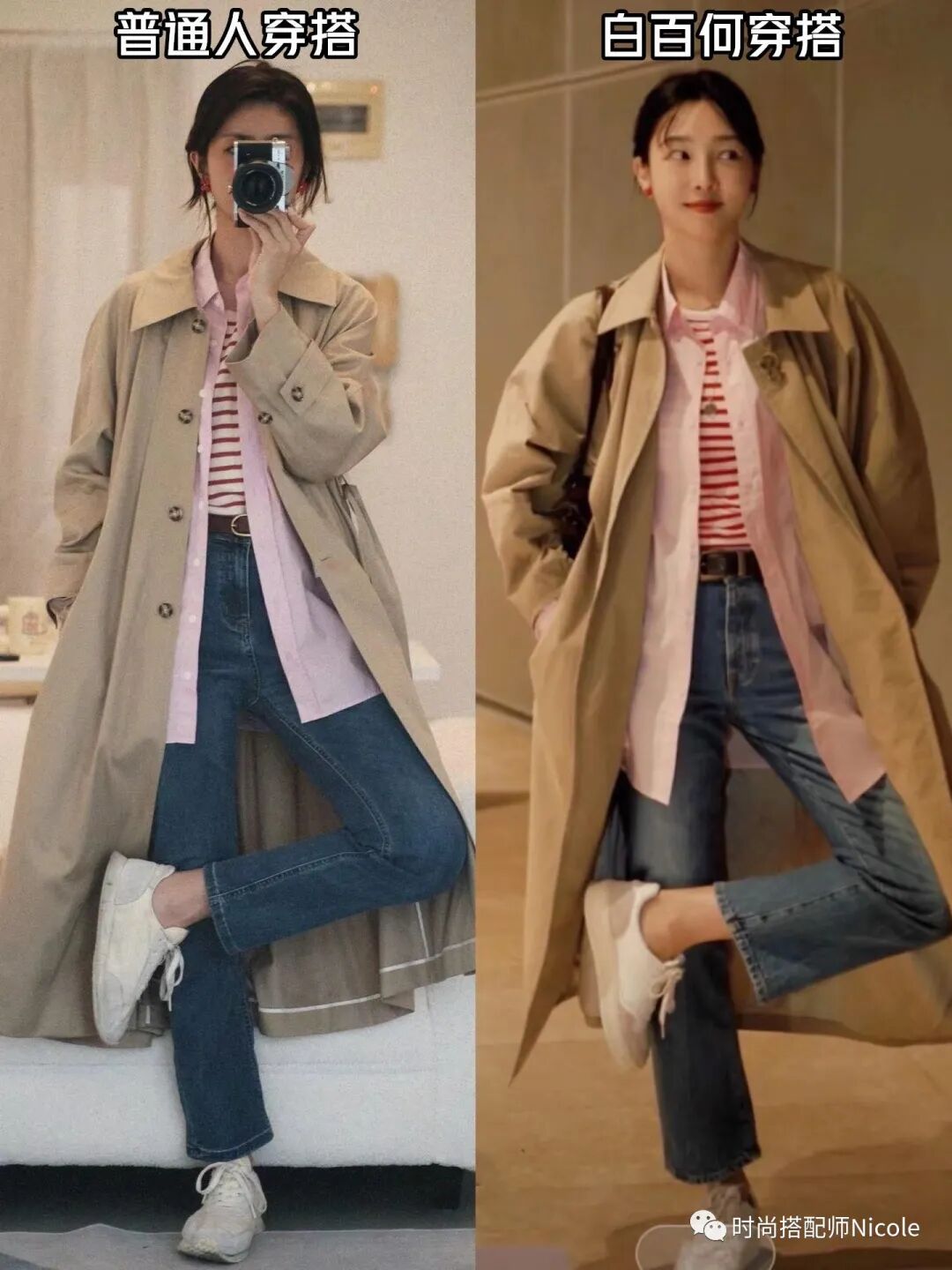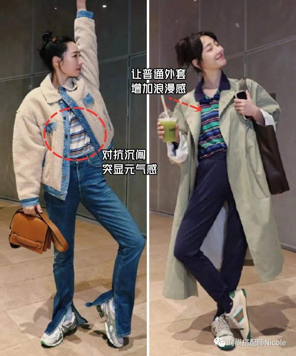 例如,可以嘗試把純色內搭換成彩色條紋衫,給基礎色穿搭打造了對抗沉悶的空間,基礎外套+印花內搭的穿搭,也完全不會出錯。▼▼