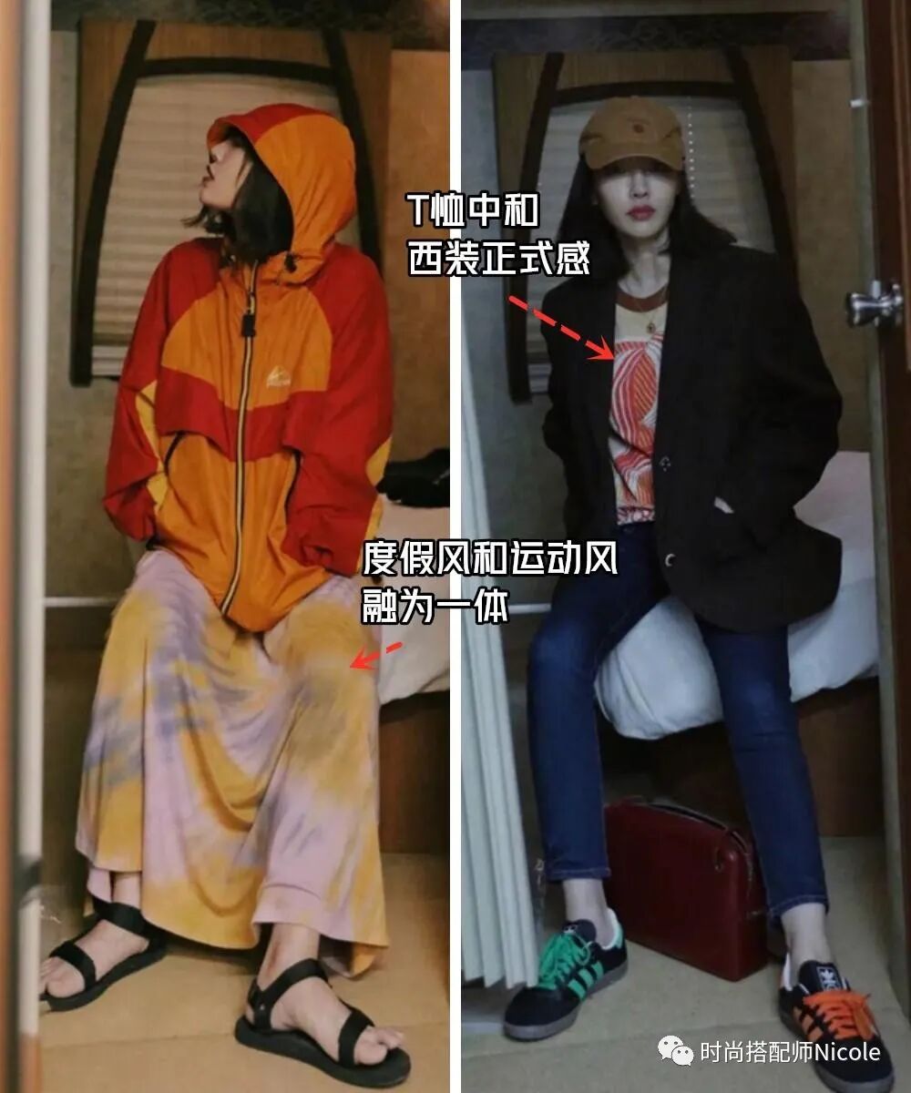 混搭在一些很容易翻車的單品上尤其好用,例如很容易穿出“校服感”的運動上衣,搭配運動褲難免感覺土味,換成度假風的長裙,則顯得慵懶又時髦。