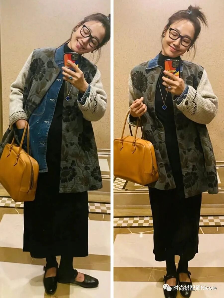 白百何的疊穿的件數大多是兩件起,常見的是三件式,例如在印花復古外套裡疊穿一件粗狂的牛仔夾克和溫柔的黑色連衣裙,三層疊加,復古、休閒、溫柔全有了,層次豐富還不顯臃腫。▼▼