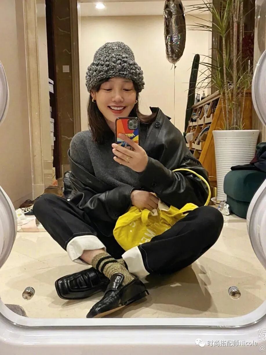 白百何的搭配裡,如果是簡單的搭配,那就一定會有襪子的參與,在兩件式的穿搭裡,可謂是一個很絕的心機了,