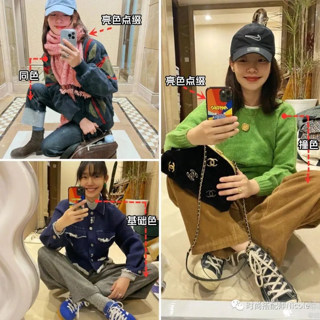 先確定上裝,然後在上裝的穿搭裡提取基礎色、或同色、或撞色來挑選下裝,最後用小面積的亮色配飾點綴,每一個顏色都出現的合情合理,亂中有序。▼▼