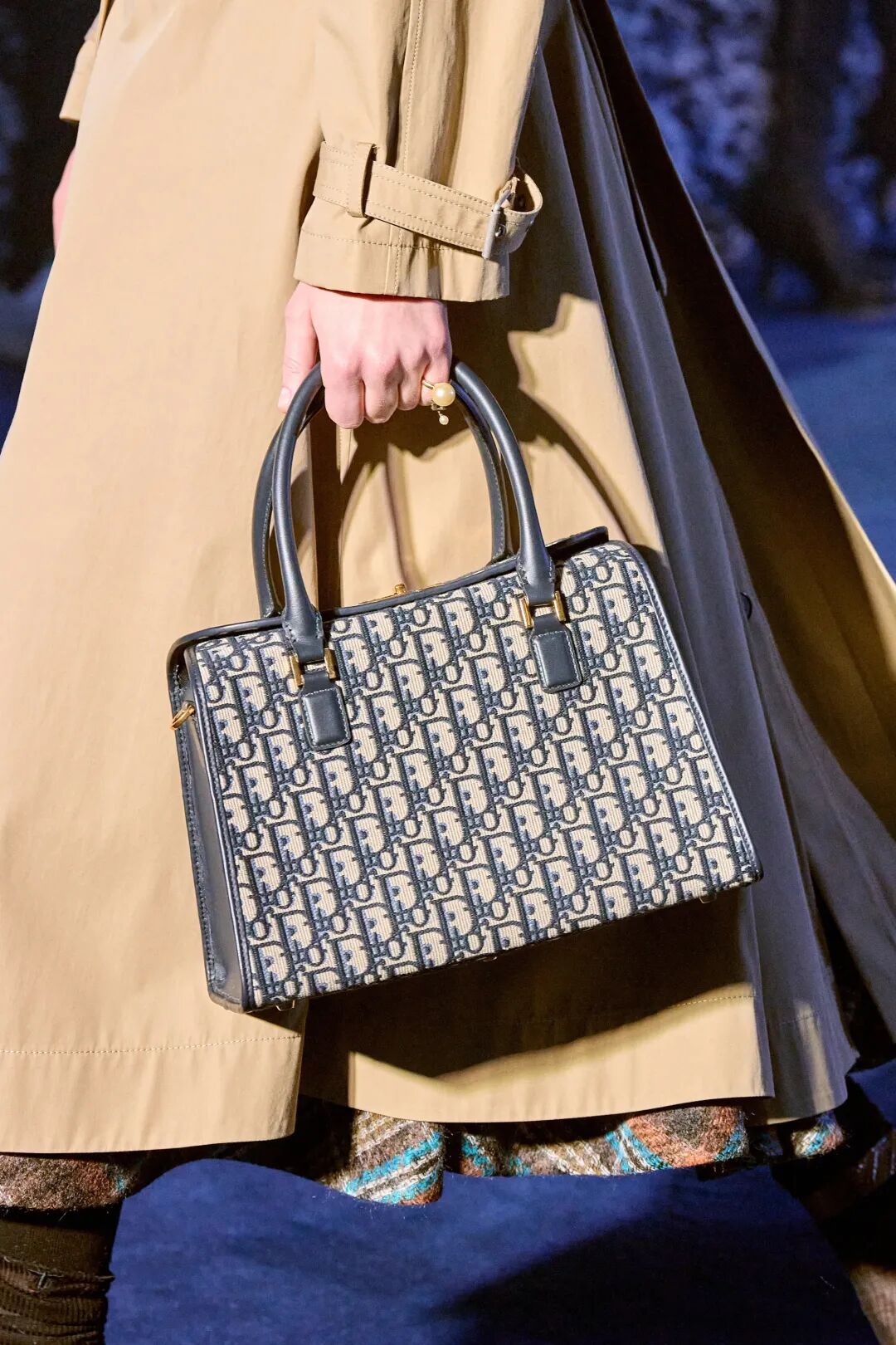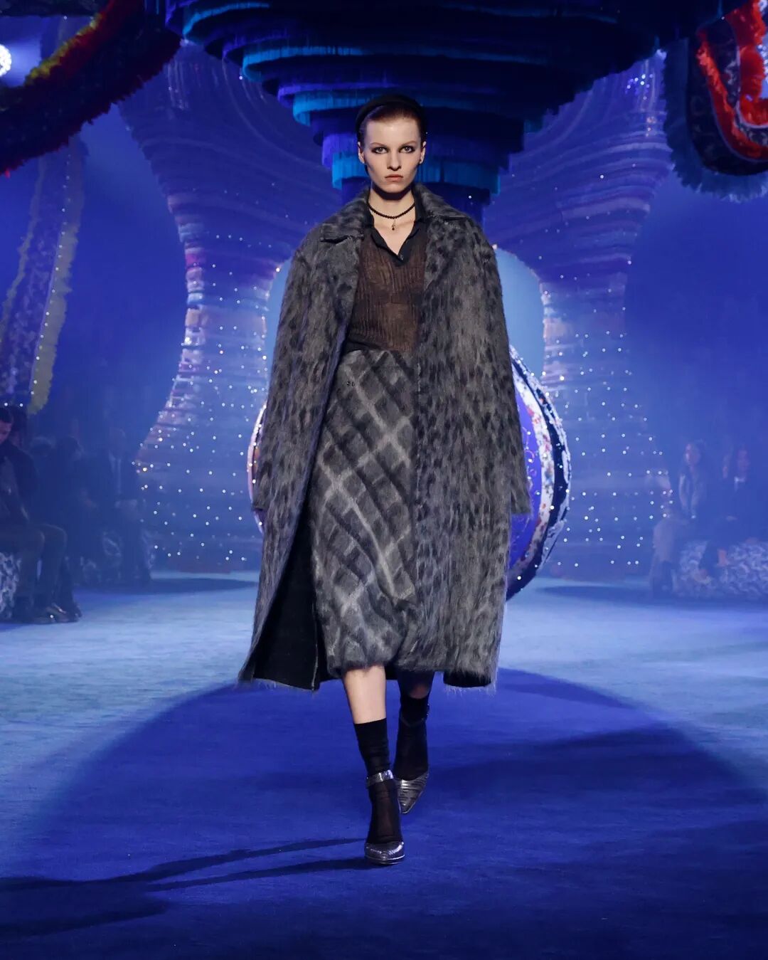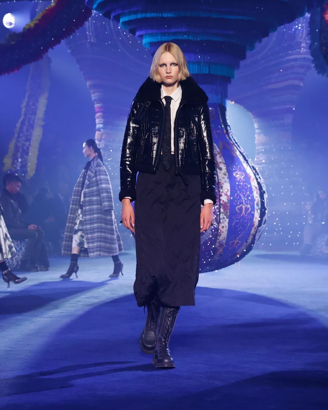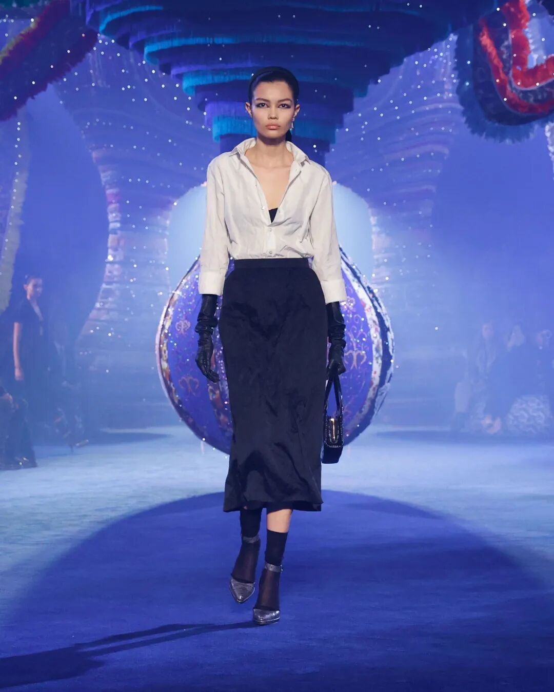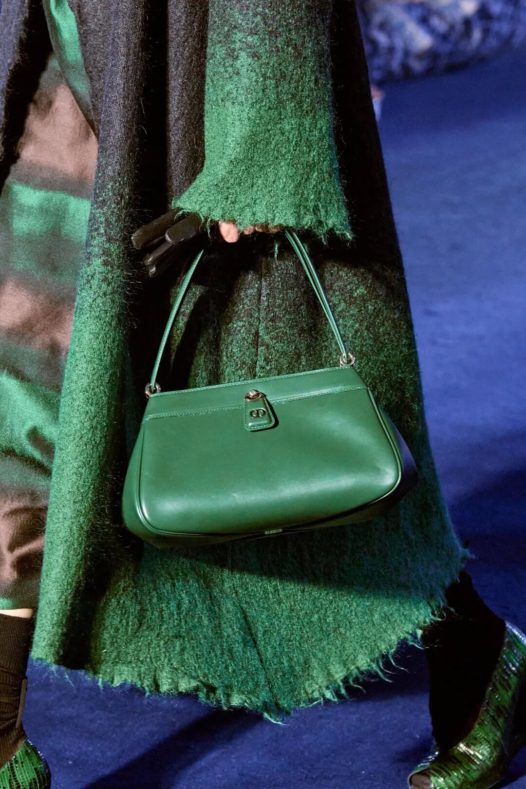 Corolle半身裙與羊毛大衣疊搭,大衣下襬處未被精細處理的線條與閃耀熠熠光澤的府綢搭配,體現了剋制美學的奧義。與此同時,低飽和度色系的漸變處理,在秀場深藍光影烘托下呈現出耐人尋味的高級美感。