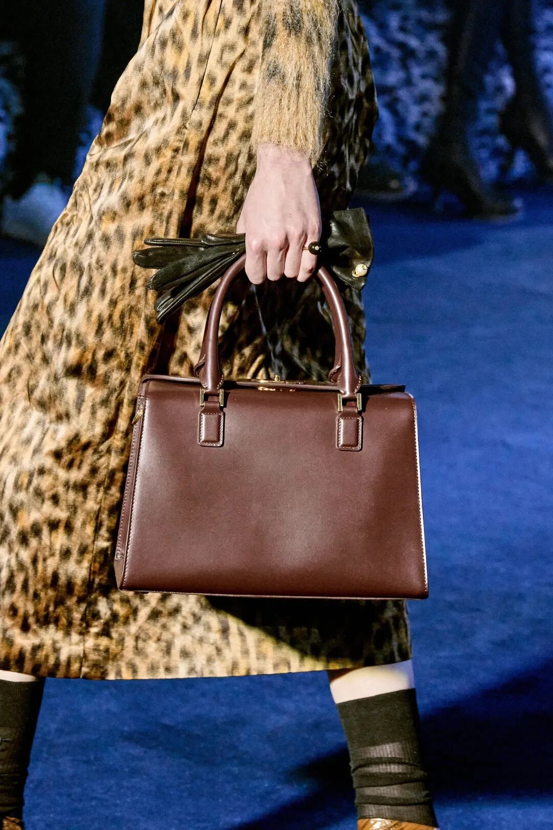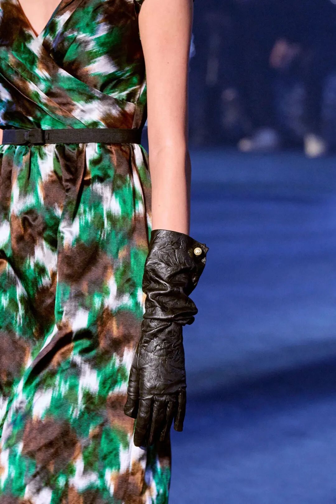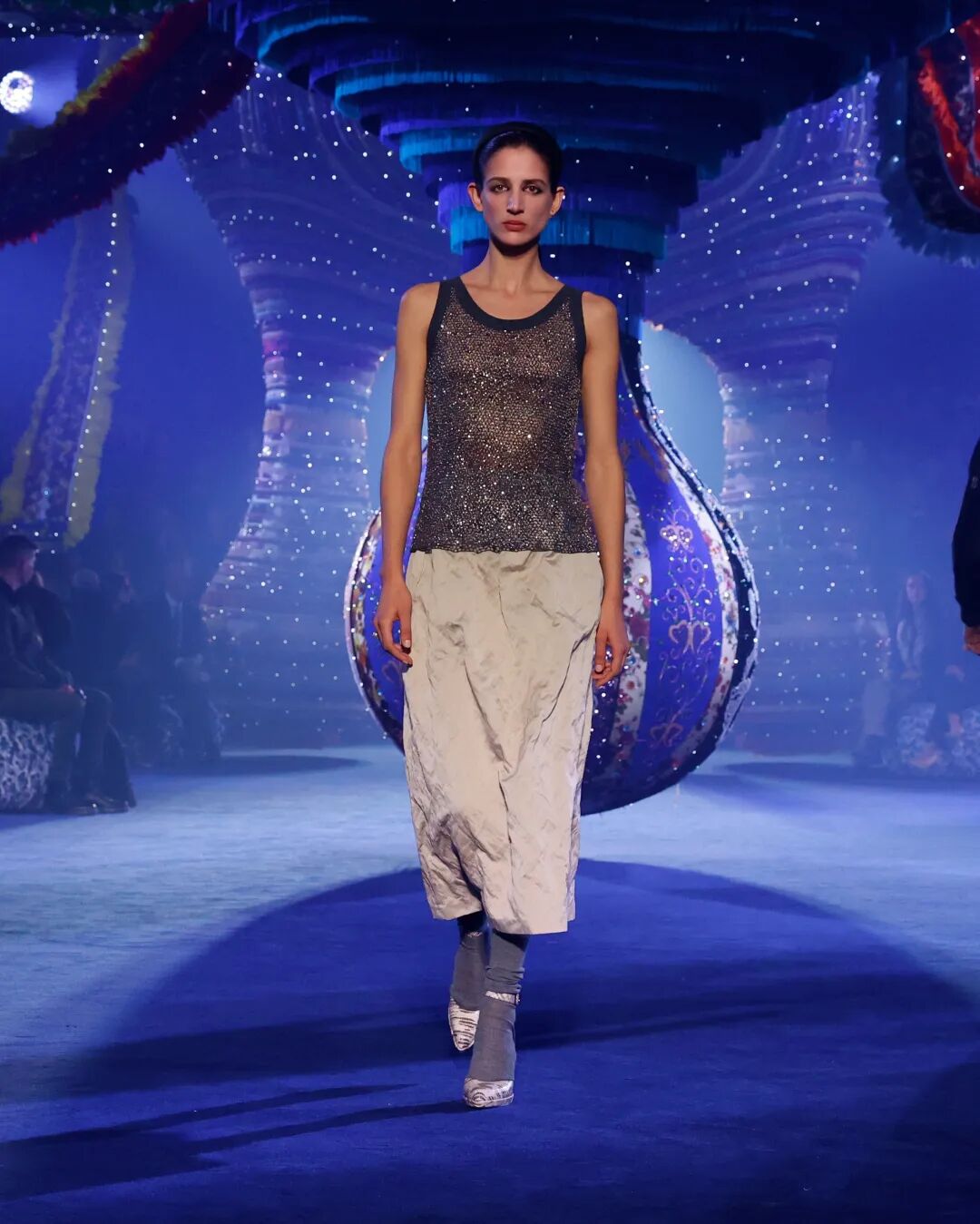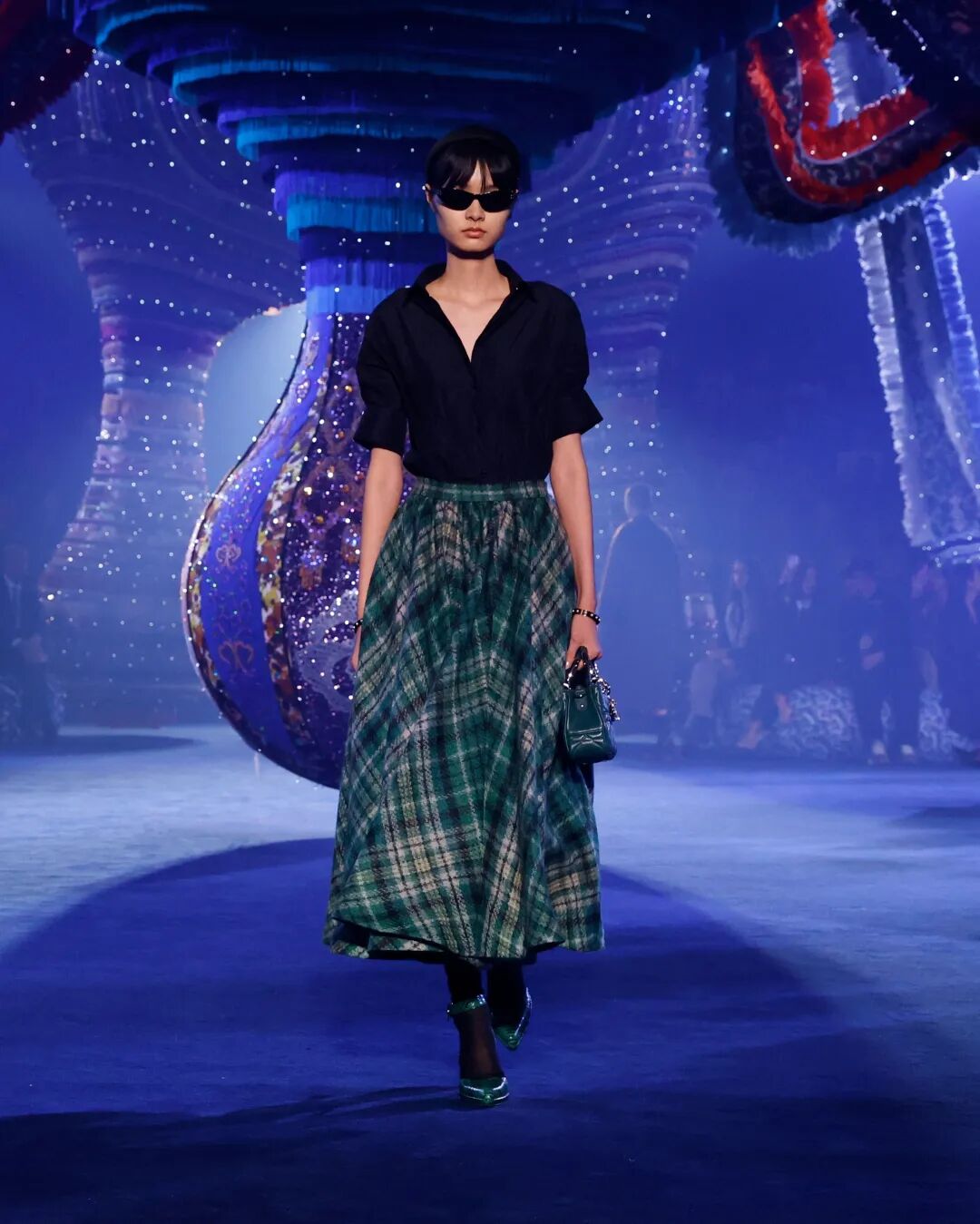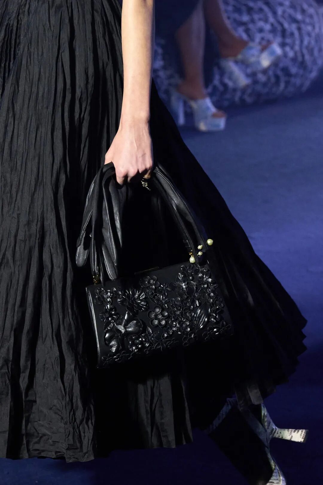 Corolle半身裙與羊毛大衣疊搭,大衣下襬處未被精細處理的線條與閃耀熠熠光澤的府綢搭配,體現了剋制美學的奧義。與此同時,低飽和度色系的漸變處理,在秀場深藍光影烘托下呈現出耐人尋味的高級美感。