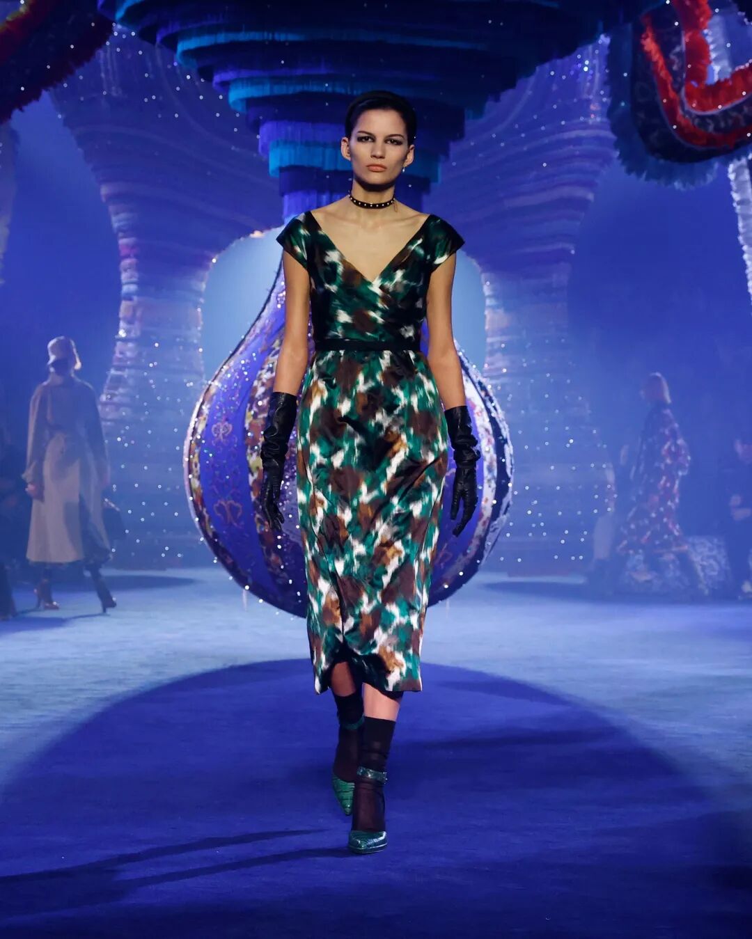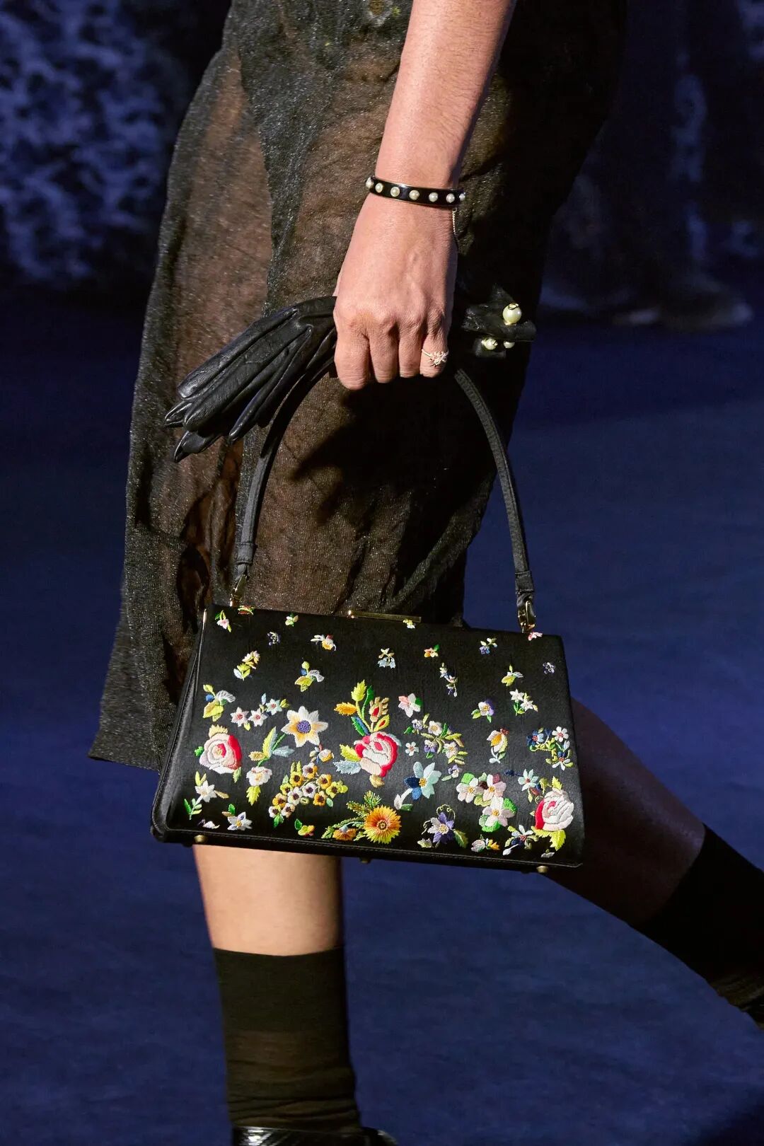 本季Maria Grazia Chiuri對花卉元素的運用更為抽象,以模糊而抽象的工藝煥新花卉全新姿態,裙襬或外套上的花朵圖案在寶石紅、託帕黃、藍、和祖母綠等主色調的映襯下,賦予女性神秘且充滿想象力的獨特氣質。