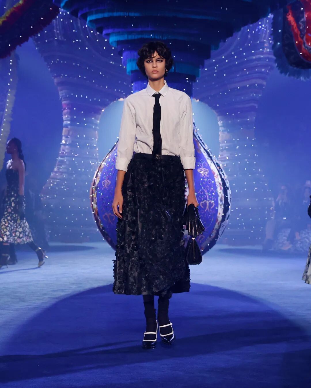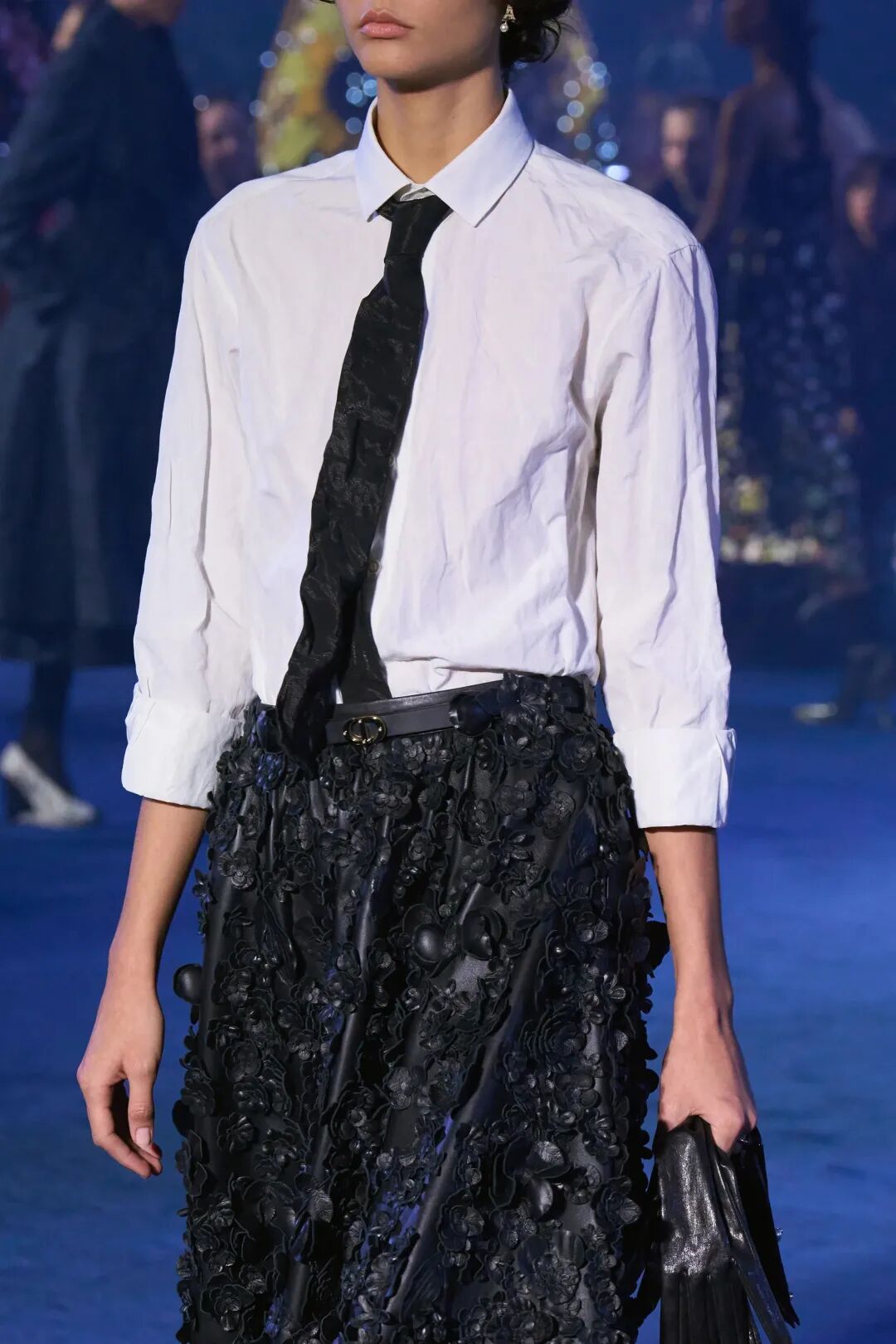 本季look重塑20世紀50年代的new look風貌,以黑白樂章開啟,白衫搭配品牌標誌性單品的小黑裙,亦是對經典傳承的追尋。