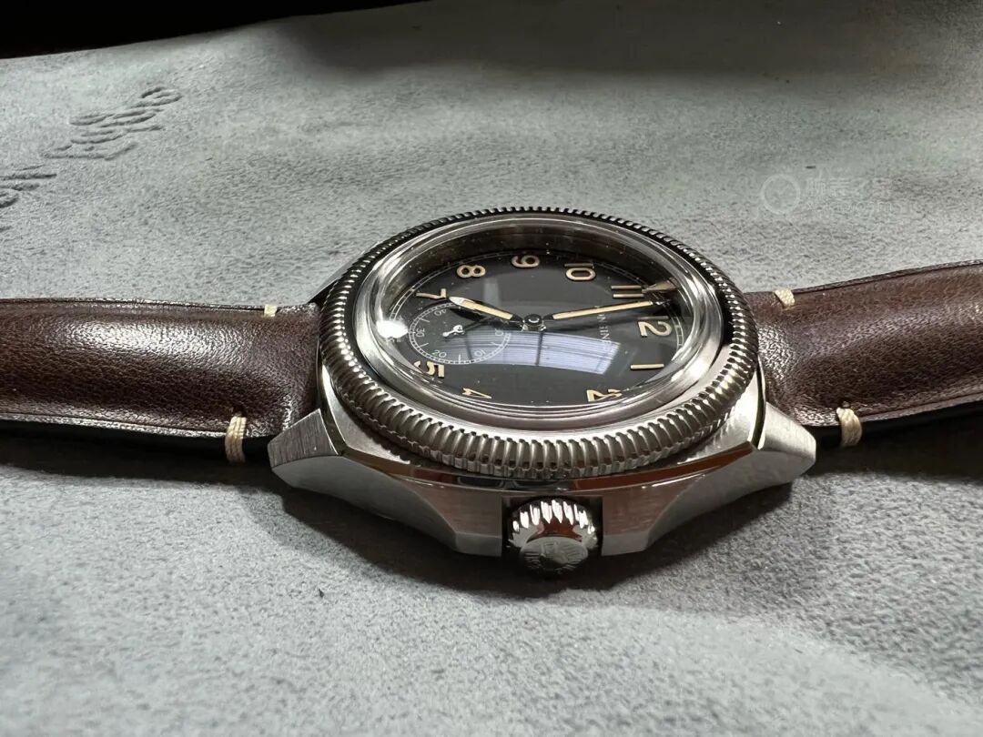 錶冠旋入式,100米防水,拉出上鍊調時,它的外圈可不是隻是為了好看,它可以兩邊轉動,表圈內小三角是對應起飛時間,以便飛行員計算飛行時間以及燃油。