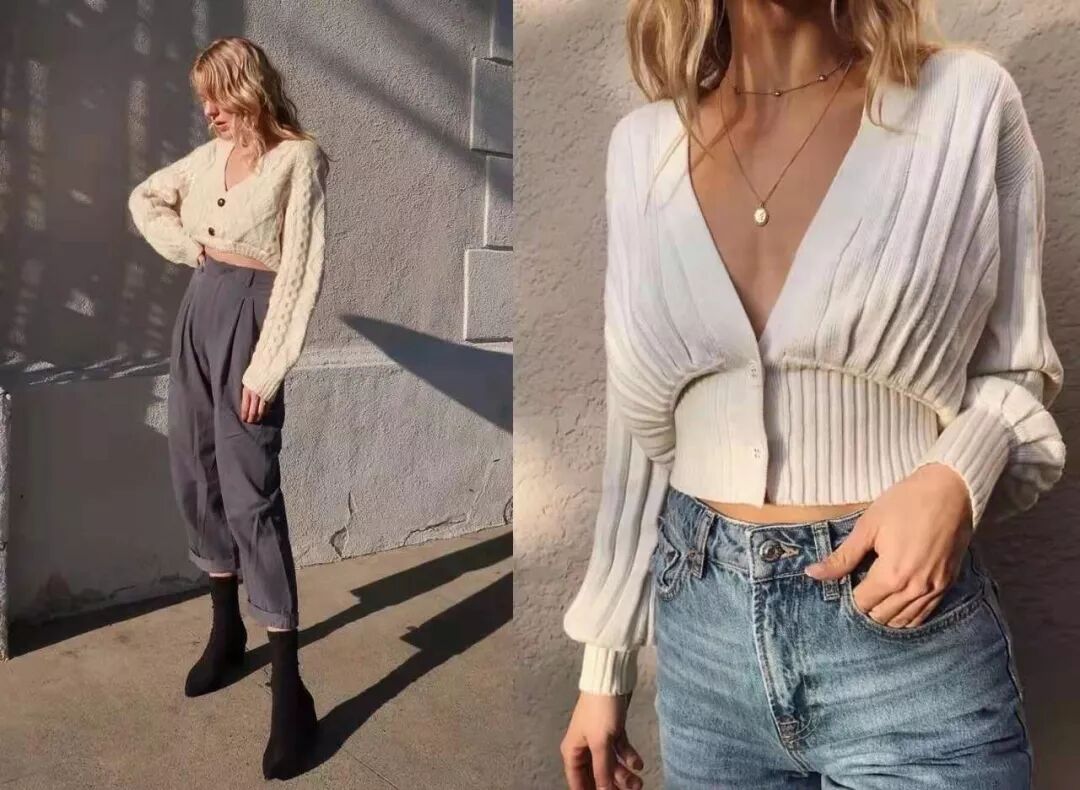 v領開衫搭配高腰褲,想不顯瘦都難!腿長一米八不是夢!