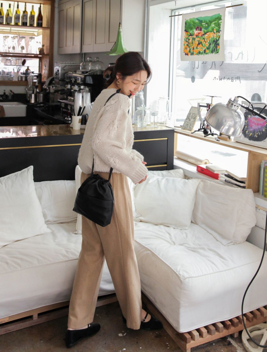 絞花樣式的毛衣帶著“媽媽牌”的溫暖,搭配米白色的奶奶褲,耐看又低調的一身,不管是居家還是逛街都是率性擔當。