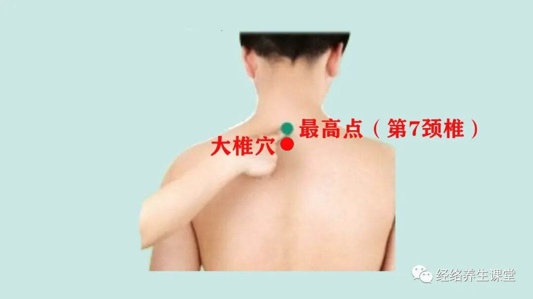 1、大椎穴低頭在後脖子處有一個凸起的高疙瘩,這個最高點即為第7頸椎,它的下面凹陷處就是大椎穴穴,按壓有酸脹感。