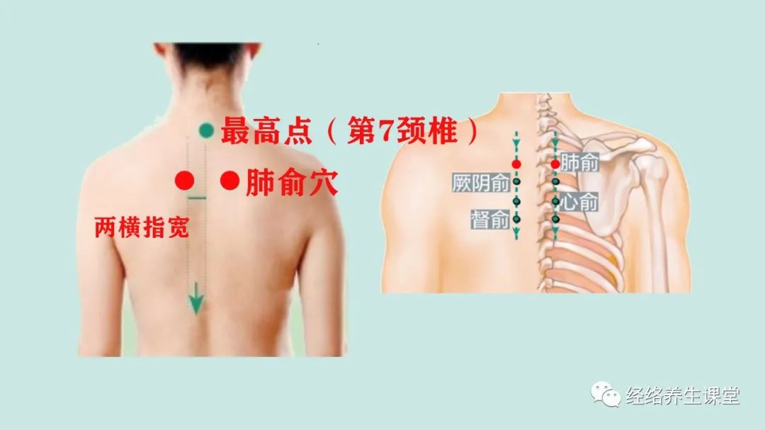 2、肺俞穴位於後背,低頭屈頸,頸背交界處椎骨高突向下推3個椎體,下緣旁開2橫指處就是。