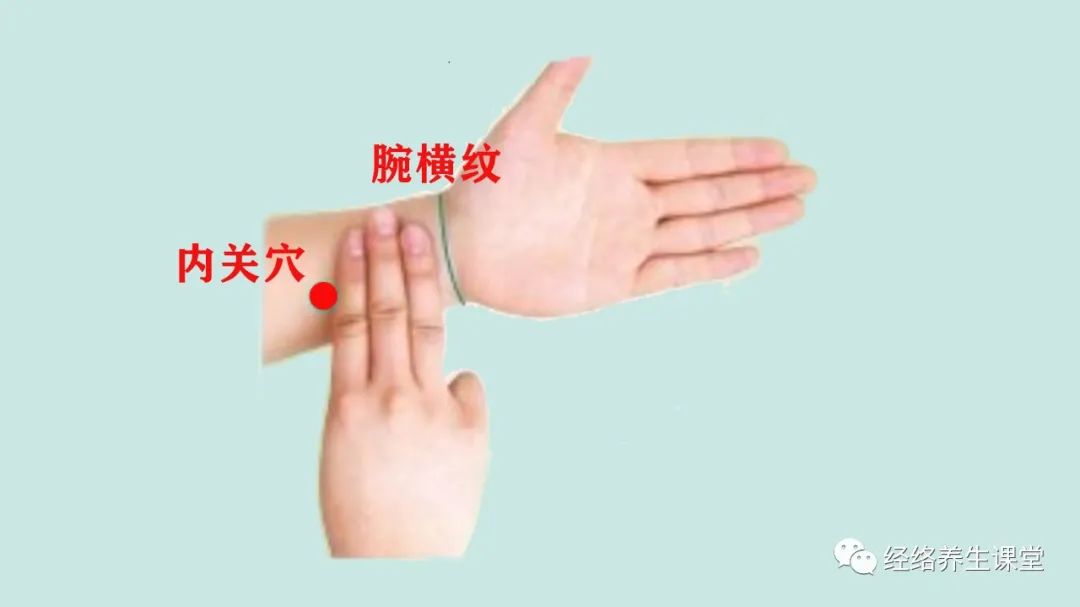 2、內關穴在前臂前區,腕掌側遠端橫紋上2寸,掌長肌腱與橈側腕屈肌腱之間。曲肘微握拳,從腕橫紋向上3橫指,兩條索狀筋之間即是。大家注意,腕橫紋為轉一圈的那道紋。