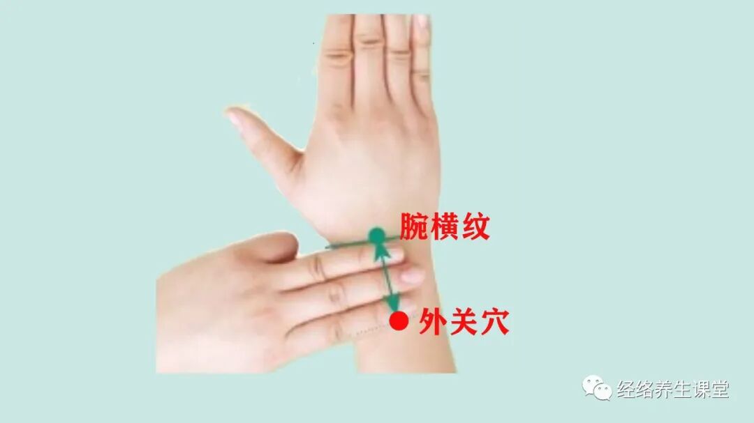 3、外關穴在前臂後區,腕背側遠端橫紋上2寸,尺骨與橈骨間隙中點。抬臂俯掌,掌腕背橫紋中點直上3橫指,前臂兩骨頭之間的凹陷處就是。