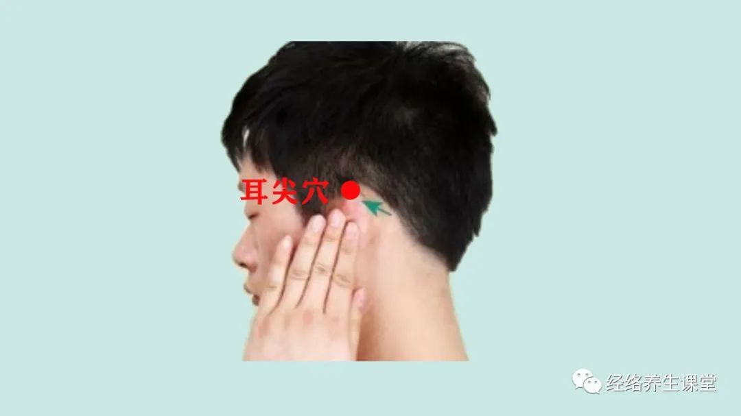 3、耳尖穴位於耳朵最頂端,將耳郭折向前方,耳郭上方尖端處就是。