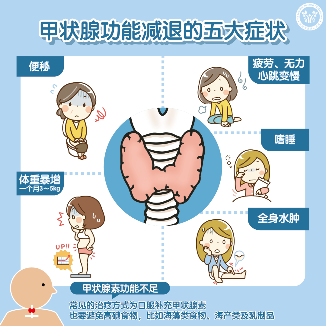 如果出現不明原因的疲憊或甲狀腺功能減退症的任何其他體徵或症狀,如嗜睡浮腫便秘皮膚乾燥面部蒼白,請及時就醫。