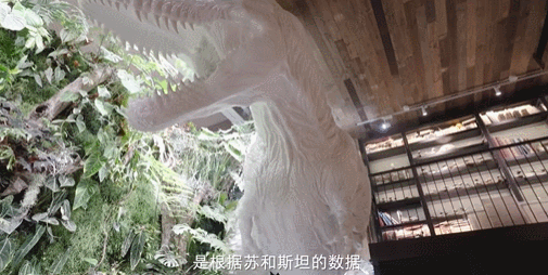 他從小就有一個在家裡養只“霸王龍”的夢想,於是在植物牆前放置了一隻高達613.58釐米的蘇和斯坦霸王龍,植物也是人工組培繁育的恐龍時代就有的品種。