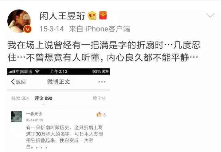 有人對他的狂接受無能,說他不尊重對手,沒有大國風範,可有觀眾聽懂了他的弦外之音:有一隻摺扇叫做歷史,這隻摺扇上寫滿了30萬人的名字,可日本人卻想把它摺疊起來,使它變成一片空白……