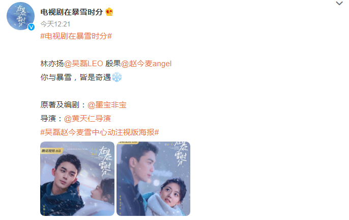 那麼對於吳磊和趙今麥剛剛官宣的電視劇《在暴雪時分》,你會想追劇嗎?