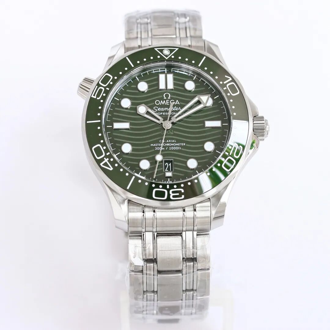 綠盤海馬300米潛水錶,又是給了表友們一個全新選擇。與其他海馬300米一樣,綠海馬的精鋼殼體尺寸也為42毫米,10點位設排海閥門,而深綠色陶瓷表圈,上面飾以白色琺琅潛水刻度。綠色盤面也採用也採用拋光綠色陶瓷製成,拿激光去鐫刻波紋圖案。鏤空指針和浮雕小時刻度均經過鍍銠處理,覆有白色Super-LumiNova夜光塗層,6點鐘設綠盤同色日曆開窗。機芯方面,可以透過背透設計直擊8800至臻天文臺機芯,帶有標誌性的阿拉伯風格的日內瓦波紋修飾,METAS認證至臻天文臺機芯,可抵抗高達15,000高斯的強磁場,裝配硅遊絲的無卡度遊絲擺輪,以及雙向自動上鍊系統,滿鏈55小時動儲,防水性能300米。隨表配有精鋼錶鏈,也提供有綠色膠帶,不過我還是建議大家要是喜歡,先買鋼鏈,其他錶帶自己後配,這款腕錶要配上綠色nato錶帶,效果也很不錯。