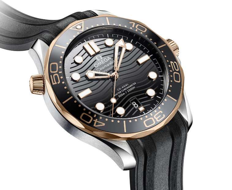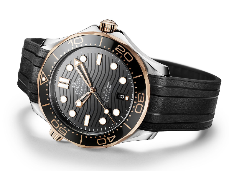 海馬300潛水錶又是一種完全不同的感覺。不同於大多數間金錶常見的造型“配方”,這隻間金海馬300潛水錶像是用金給鋼描了一層金邊,屬於非常耐看的類型。腕錶直徑42毫米,錶殼和錶鏈由18K黃金和精鋼打造而成,表圈和錶盤採用黑色陶瓷,錶盤上裝飾了海馬300潛水錶經典的波紋圖案,鏤空指針和浮雕小時刻度也全部由18K黃金製成,並覆有夜光塗層,日曆窗口位於6點鐘位置。腕錶搭載8800至臻天文臺機芯,提供55小時動力儲存,可以抵抗高達15,000高斯的強磁場,這個數據可能有點抽象,我們做個對比:腕錶一般的防磁係數是1000高斯,而至臻天文臺機芯的防磁能力是一般防磁的15倍!此外,除了上面這款黃金黑外,還有一款搭配玫瑰金的版本,也是表友心中“很有感覺”的款式。