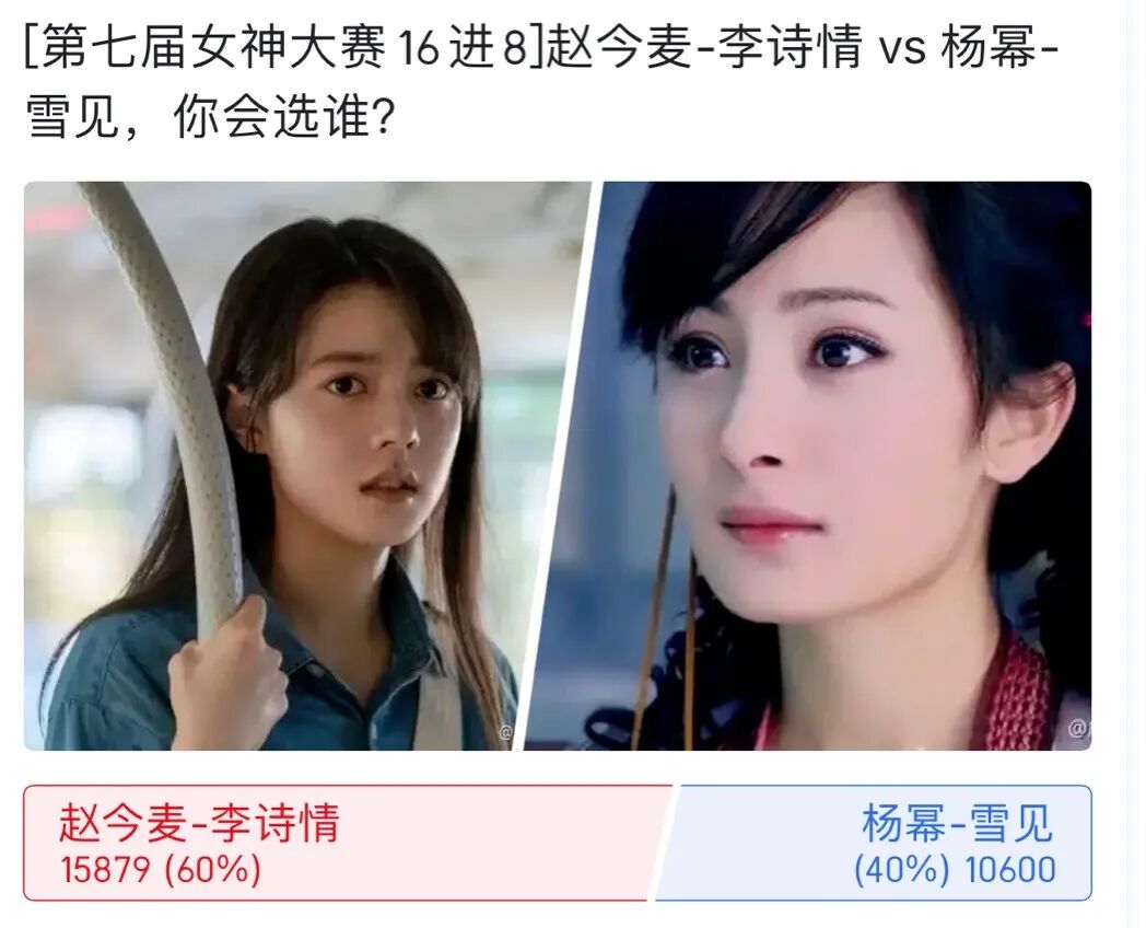 比如搬到虎撲第七屆女神大賽裡,素顏的趙今麥就以3:2贏了blingbling清水妝的楊冪。
