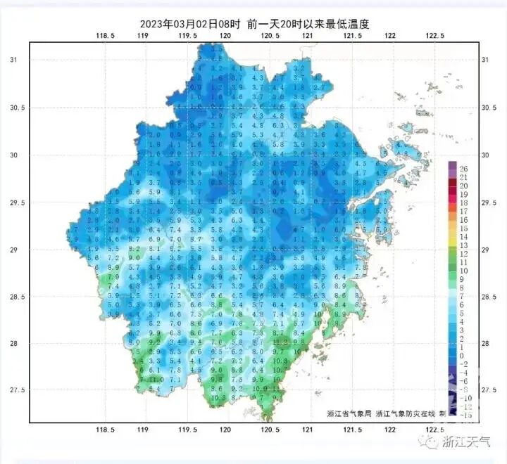 隨著冷空氣東移南下影響,今天早晨氣溫有小幅下降,浙北地區尤為明顯,大部起步氣溫3℃附近,浙北北部最低氣溫僅1-3℃,較昨日降溫幅度有4-6℃。