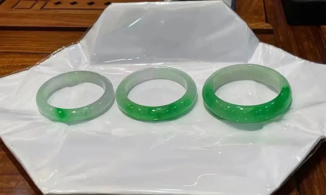 下面這三個手鐲,都是水潤清透且有底色,都好看,但是最下面的相對來說內部棉理結構多了一點,中間的跟上面的一塊料下來,都是冰種,不過中間的色和種水有些不同,所以價格從上到下就是一萬、三萬、二十萬不等。