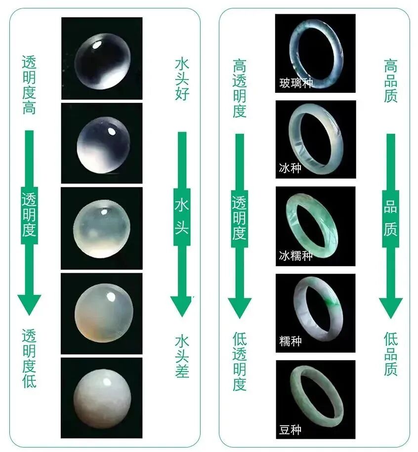 翡翠根據種水基本分為玻璃種、冰種、冰糯種、糯種、豆種!(我給翠友們整理成以下圖,能更清晰的瞭解翡翠種水~)