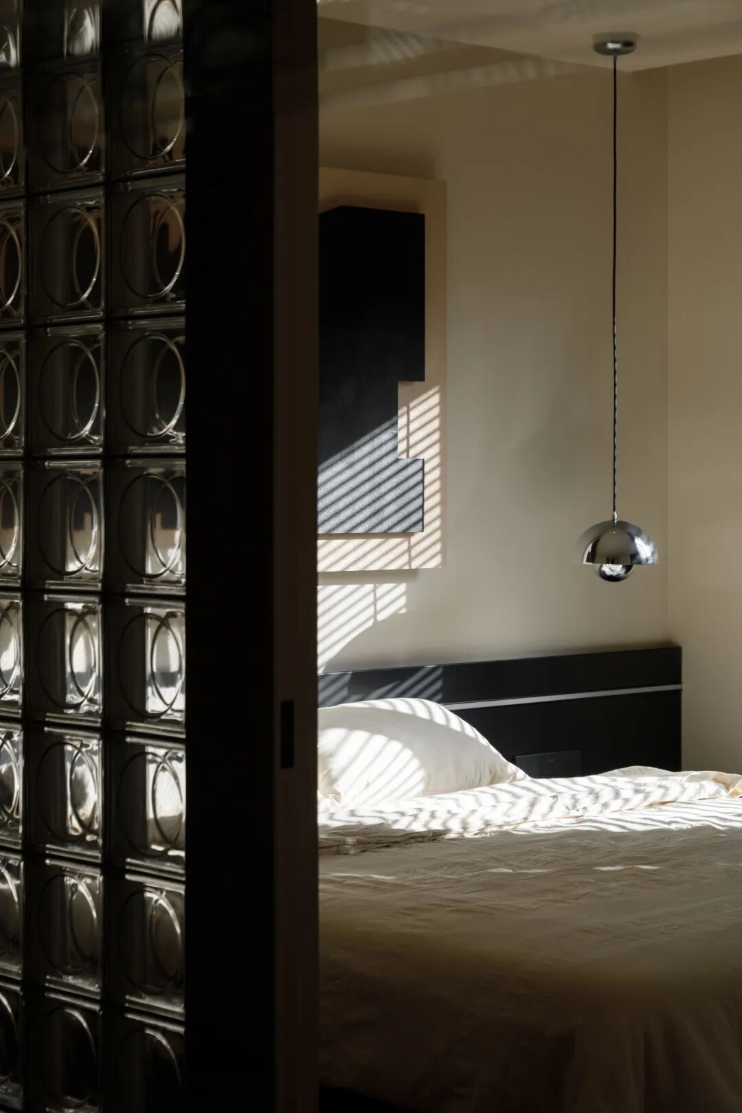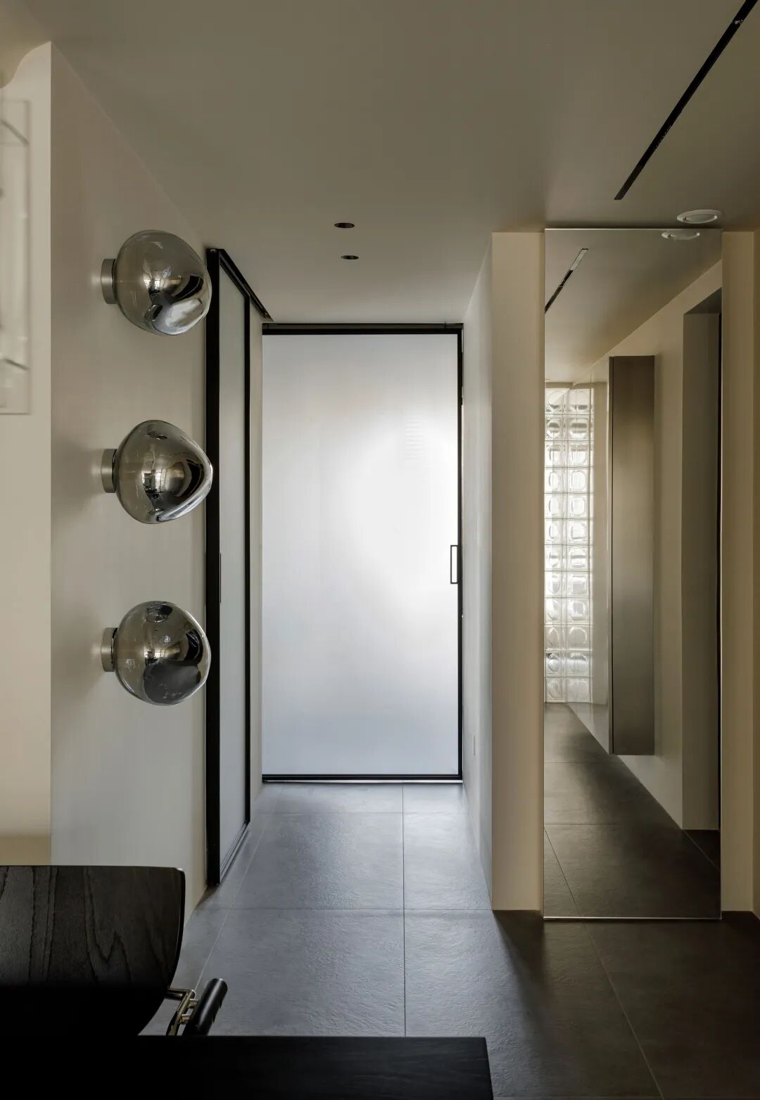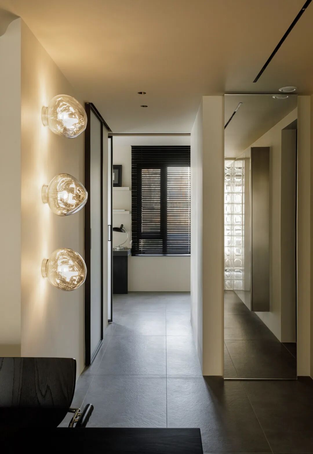 左手邊過道通往北向房間,以玻璃門隔斷,打開時增加房間的流動性,近處的燈光搭配盡頭的黑色百葉簾,有種老洋房的既視感。關閉時則像個神秘落地窗,迎著光影產生光環,讓人對窗的另一側產生無限遐想。