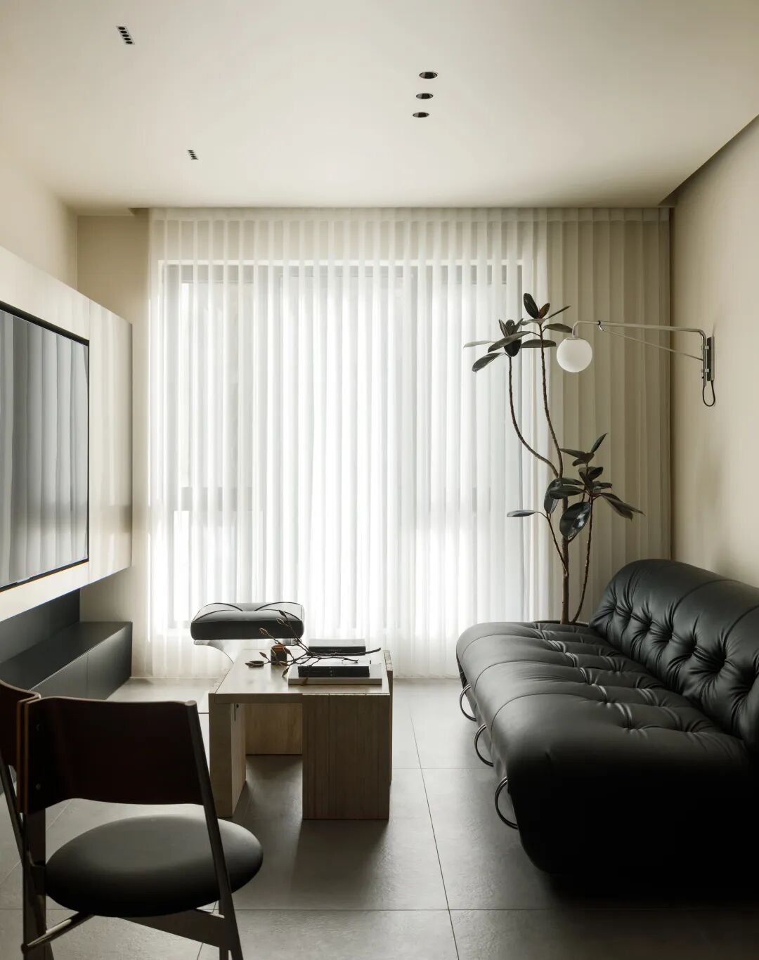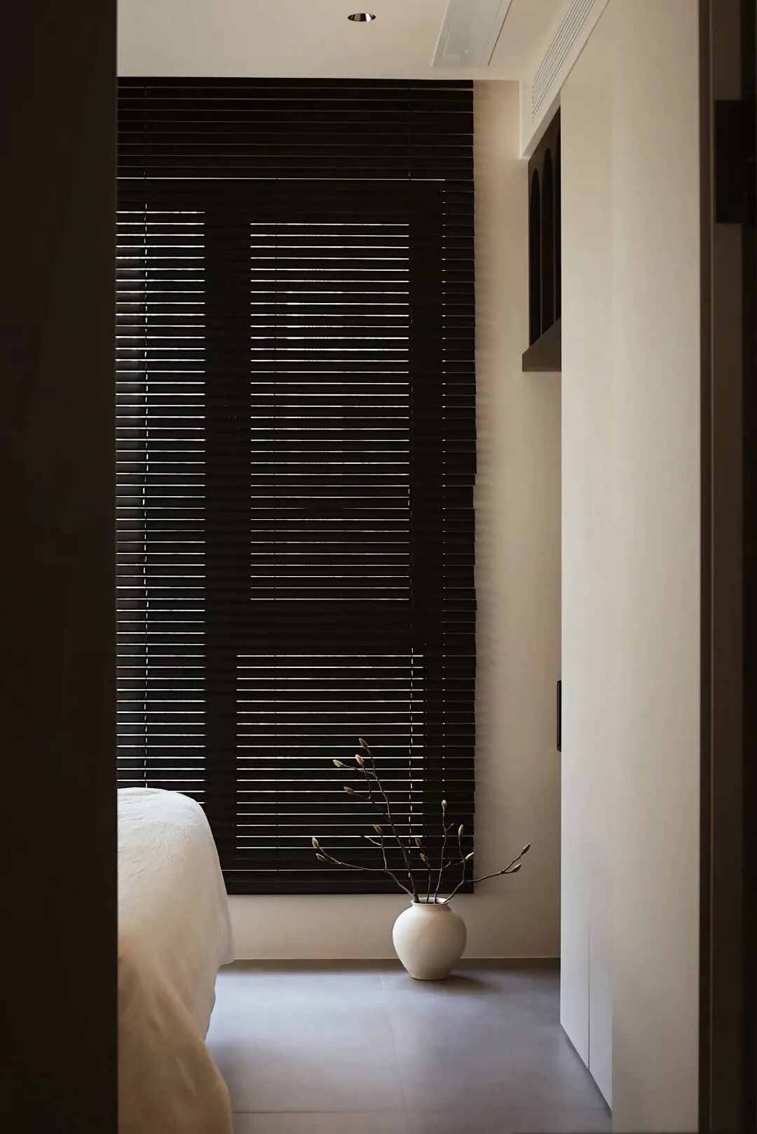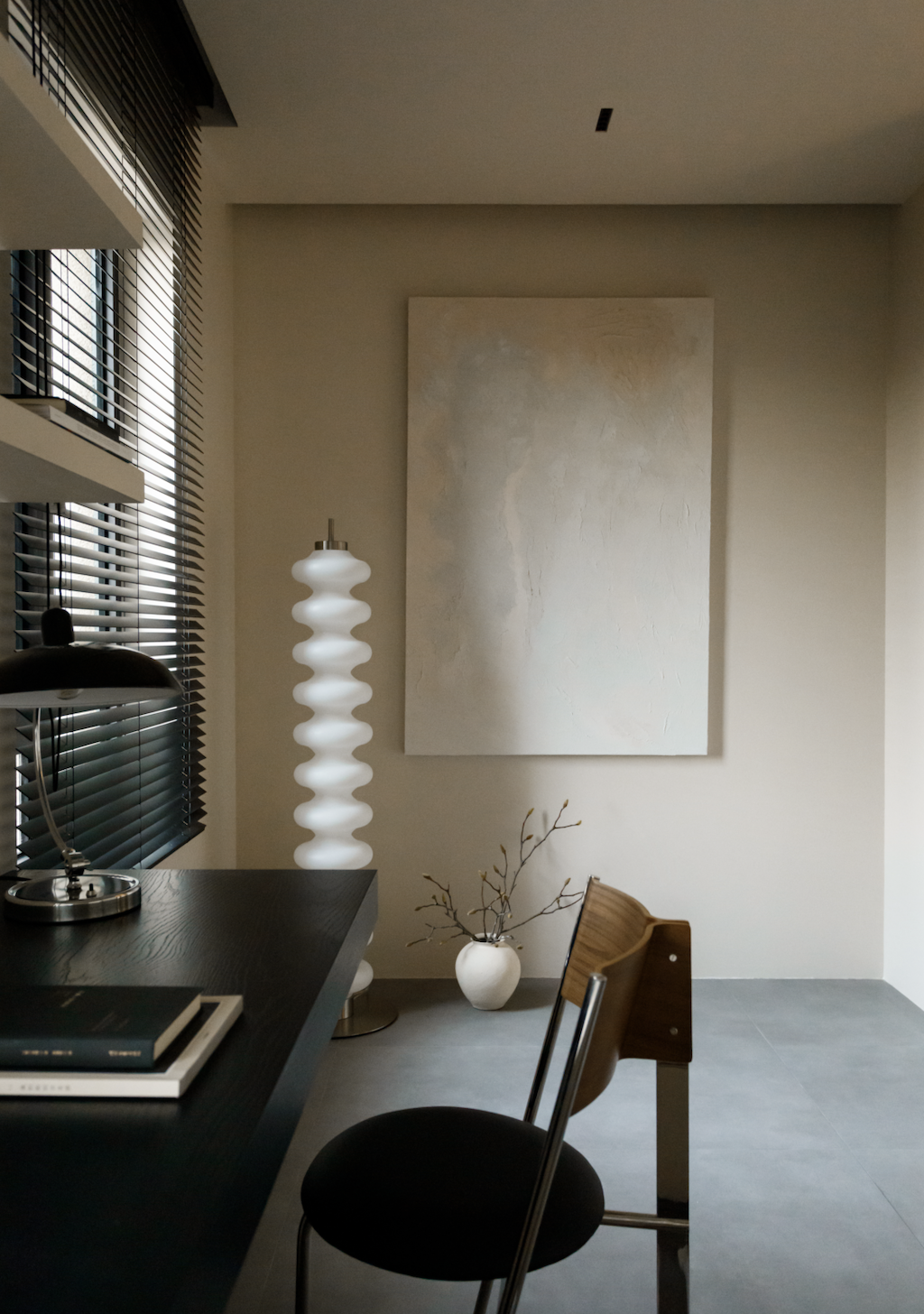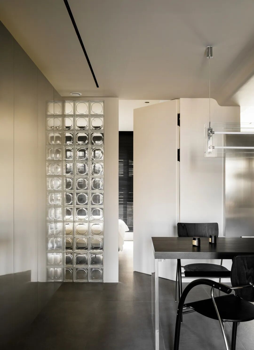 左手邊過道通往北向房間,以玻璃門隔斷,打開時增加房間的流動性,近處的燈光搭配盡頭的黑色百葉簾,有種老洋房的既視感。關閉時則像個神秘落地窗,迎著光影產生光環,讓人對窗的另一側產生無限遐想。