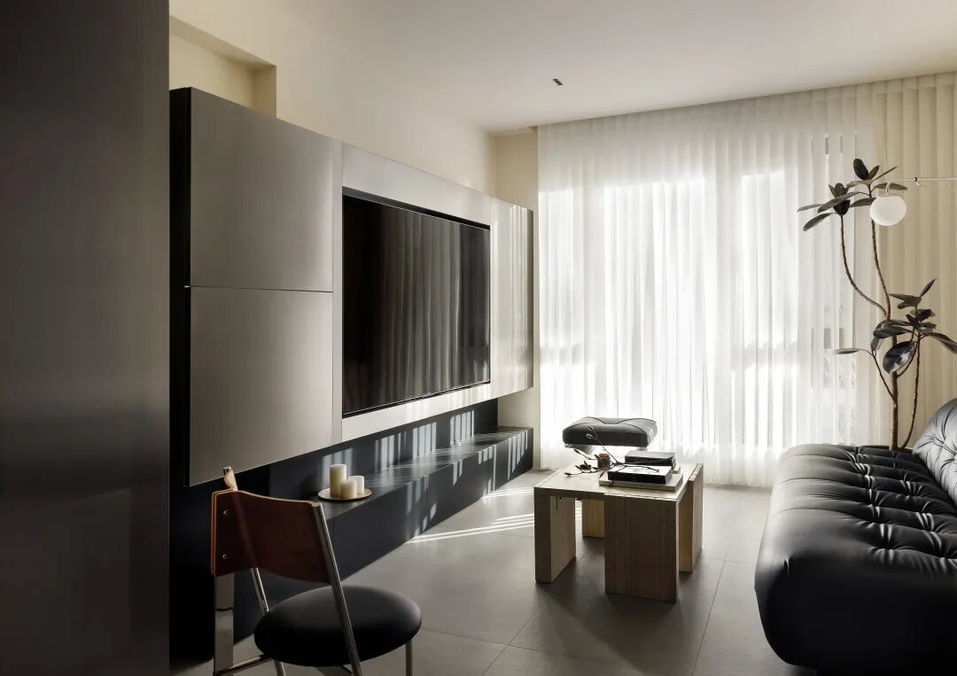 色調深沉之下,體量感便是決定家厚重與否的關鍵,電視櫃定製上牆,懸空的部分留出足夠的呼吸感,還利用牆面的高低差做出儲物電視櫃,容納下所有七零八碎的電視線和日常雜物,白天光影透過窗簾悉數落下,靈動又寧靜~