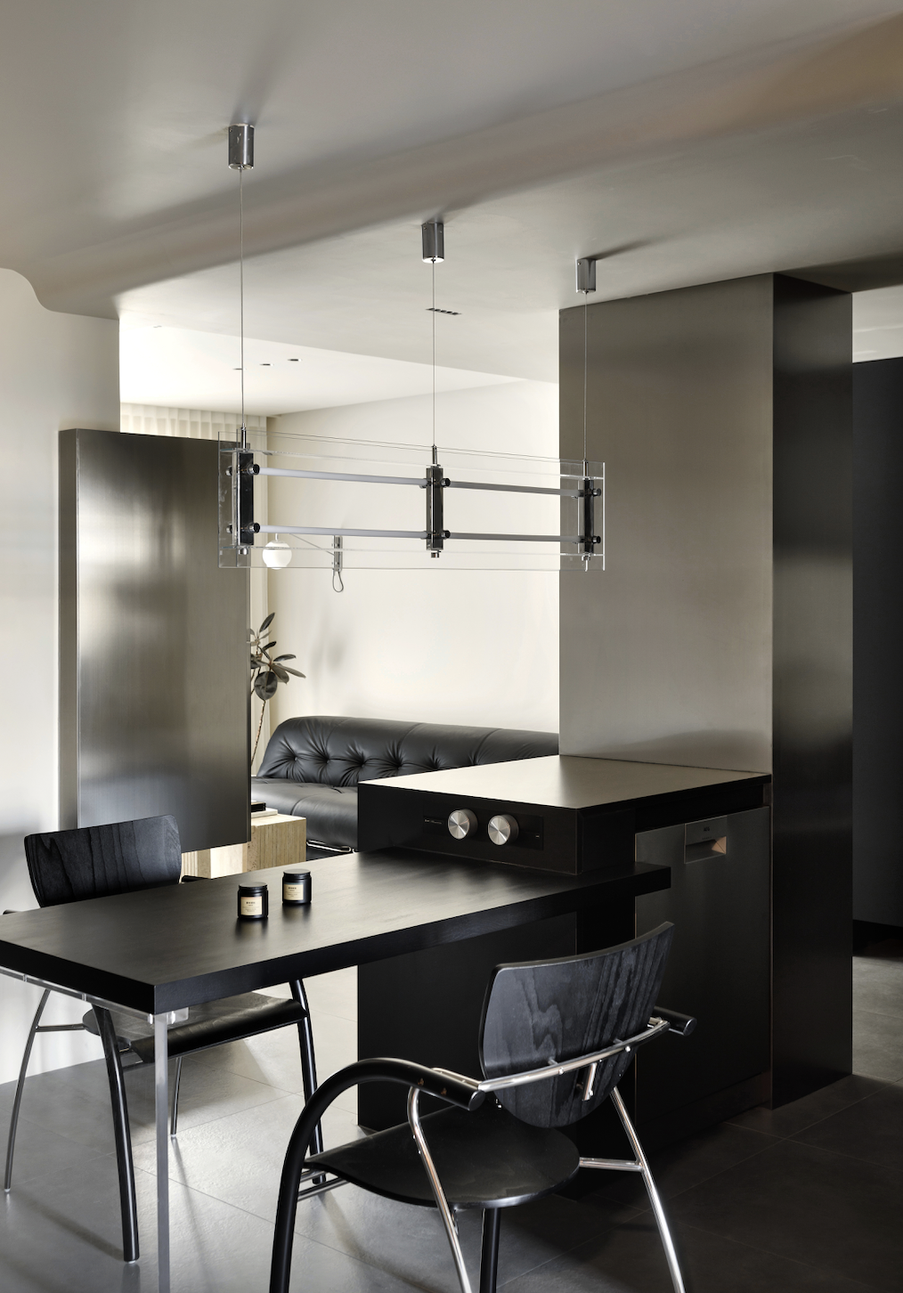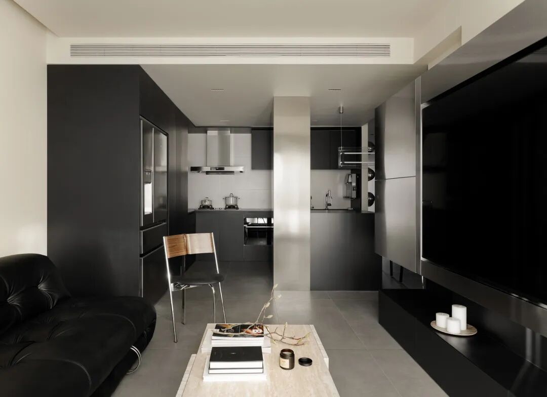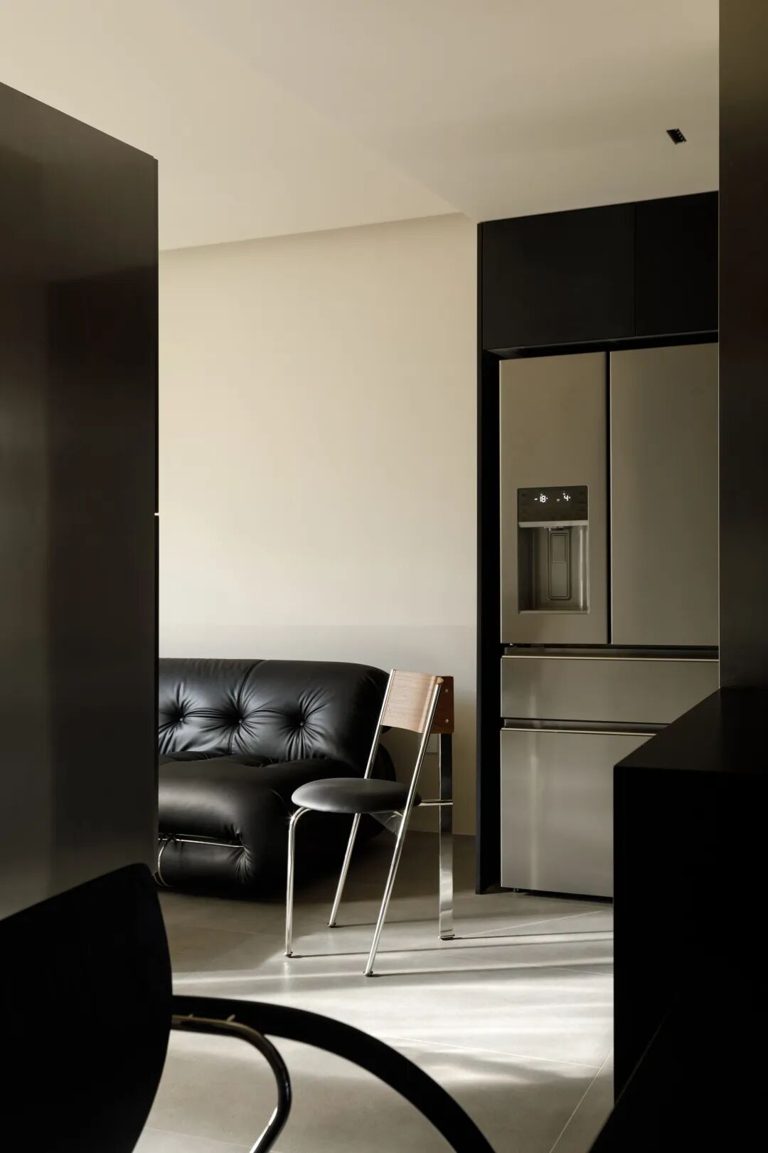 從客廳看向廚房,整個結構清晰明瞭,櫃體全部採用黑色,管道利用不鏽鋼做了包裹,視覺平衡的同時也具備屋主想要的精緻時尚感。