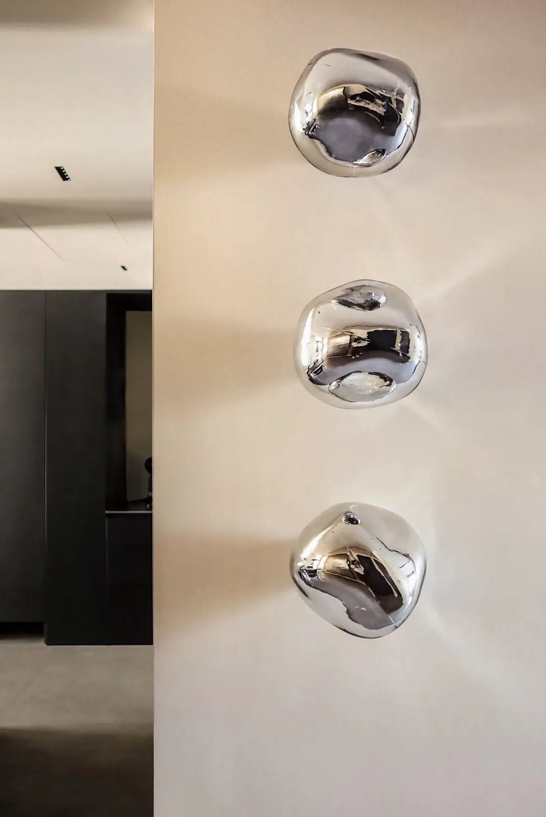 無主燈的設計圈粉了屋主兩人,不僅因為整體的簡潔效果,更解決了不同角落盲區的照明問題,牆角的圓形搖桿壁燈,立體的光源打造更柔和的氛圍感,既能滿足不同情境下的燈光需求,又有很好的裝飾性。