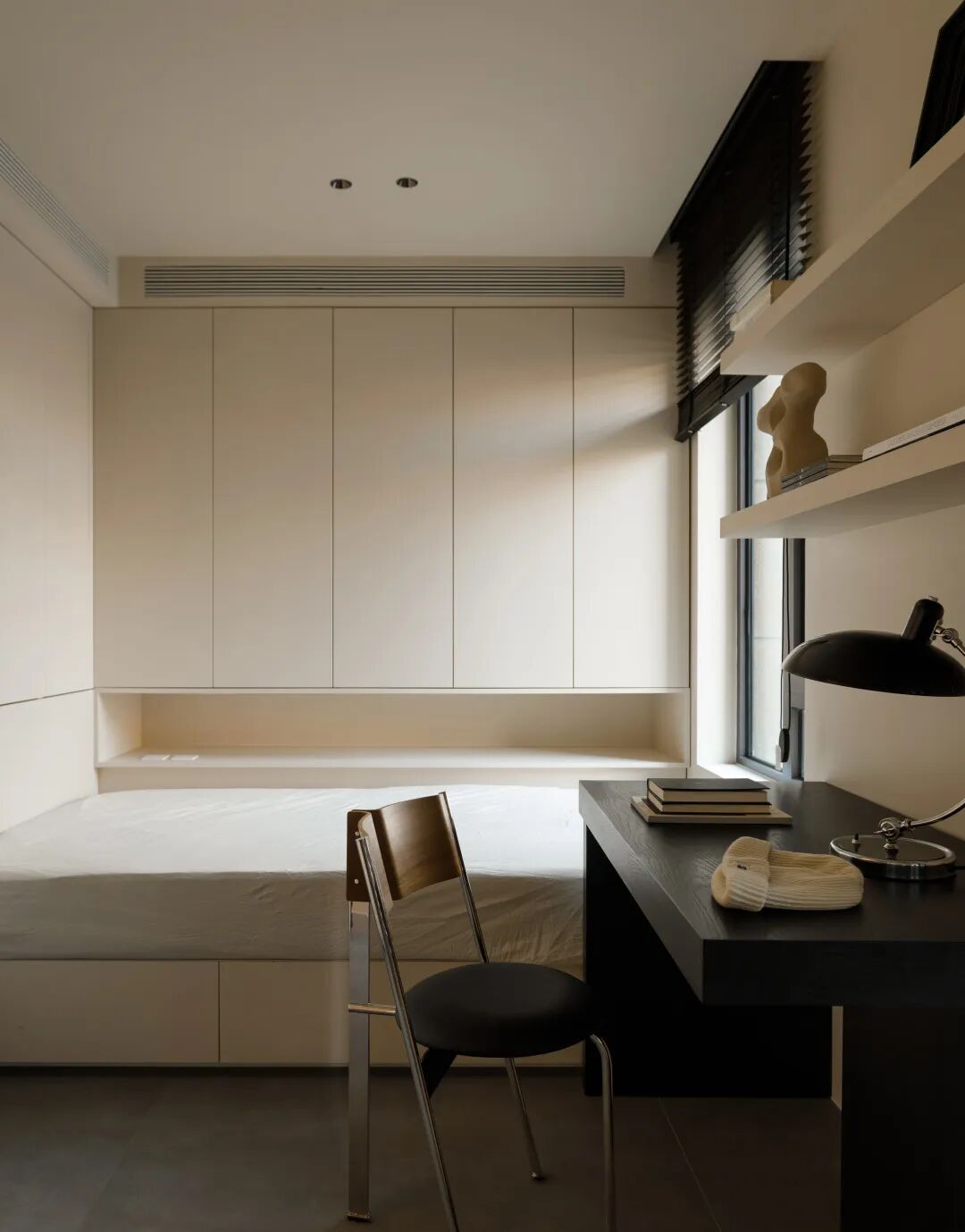 調整後的臥室活動空間變大,收納功能也較以前更強了,還特別增加了嵌入式幕布,方便兩人的晚間觀影時光,看個電影聊聊天,愜意自在。