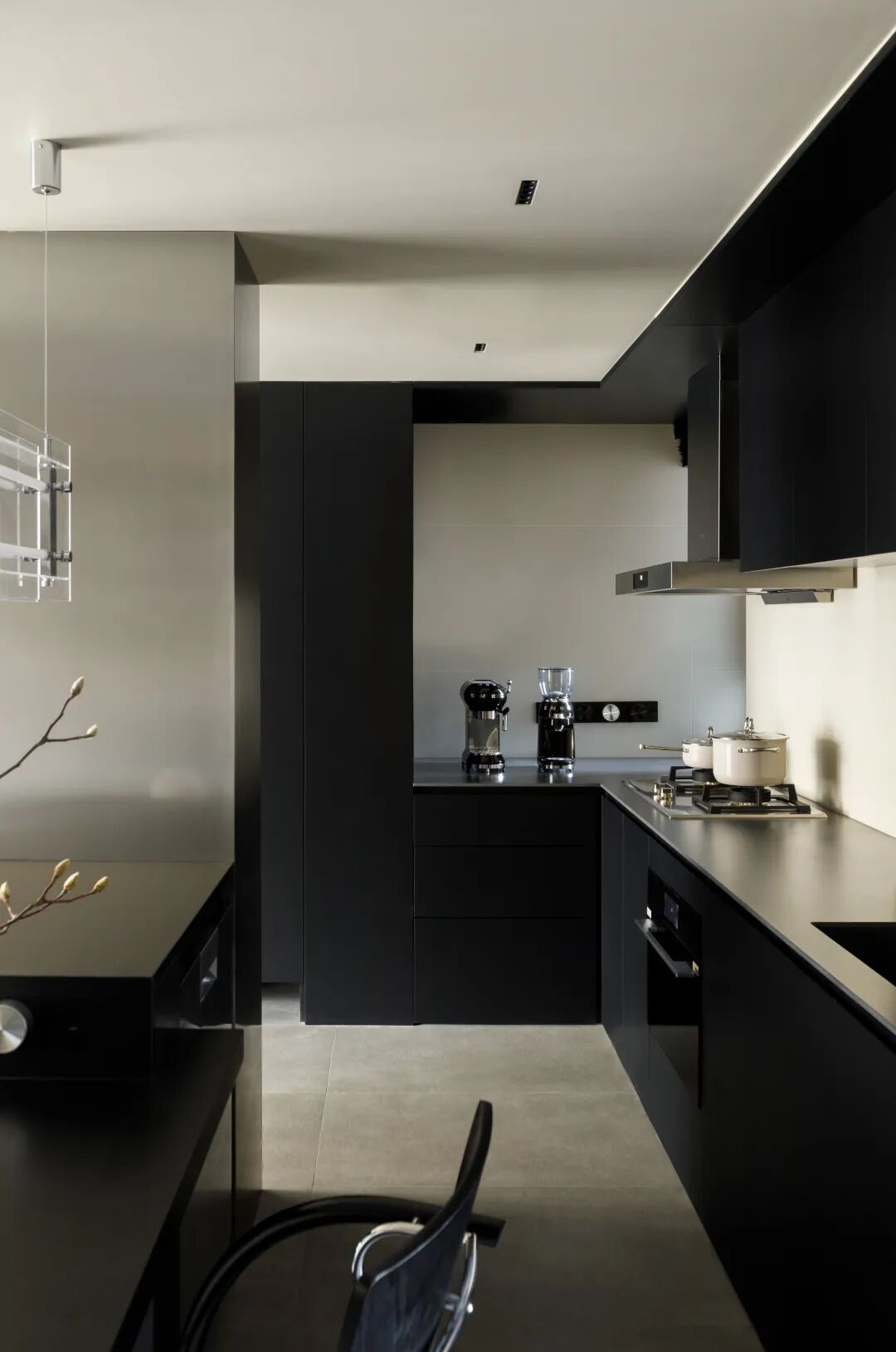改造後的廚房檯面有3.4米的長度,依次排列了冰箱、收納、灶臺、備菜空間…井然有序的同時也最大限度讓動線合理化。地櫃+吊櫃的強大收納面積,讓檯面可以簡單利落,黑色櫃體從頂到地的包裹,中間以乳膠漆過渡,理性中包裹感性。