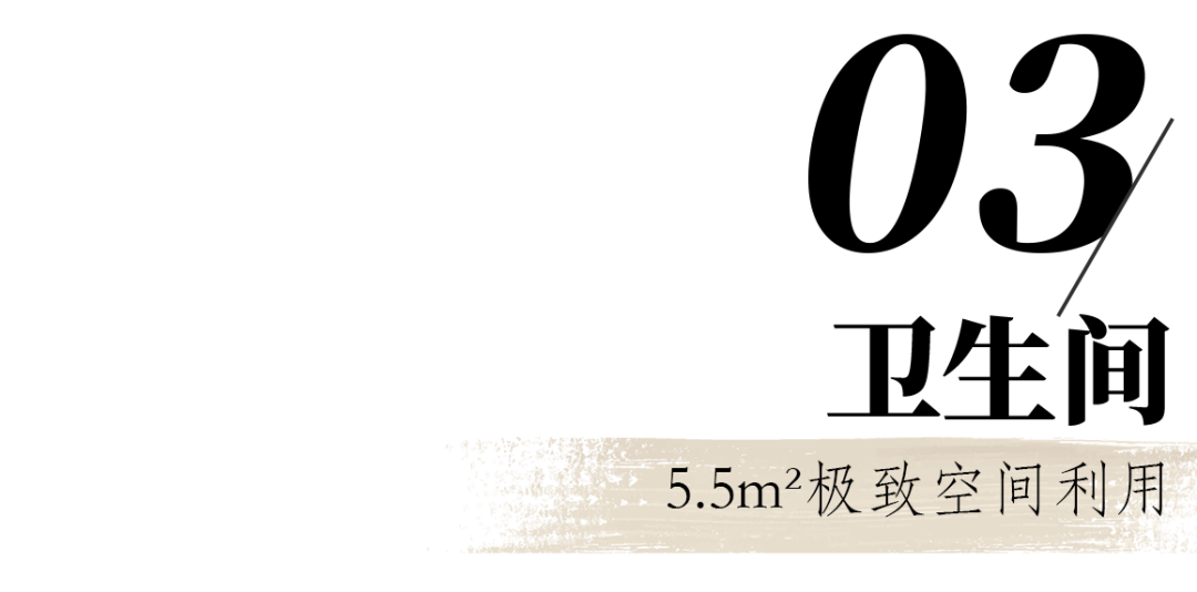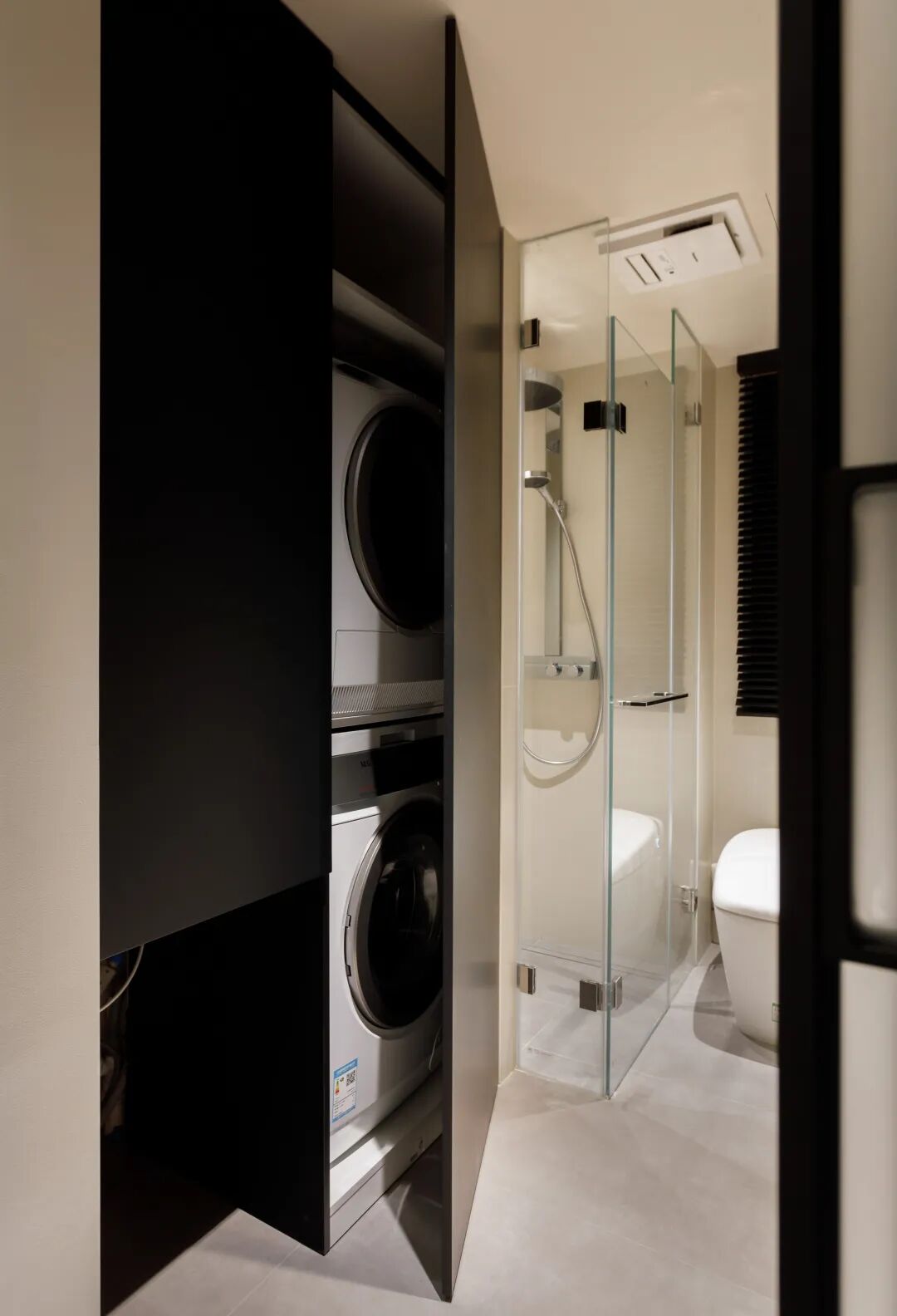 經過重新劃分,衛生間最終保留了5.5m²的空間,設計師利用櫃體、透明隔斷、垂直收納等方式將洗衣乾衣機、mini洗衣機、貓咪廁所、淋浴、洗漱、馬桶等所有功能區依次羅列,在有限的面積內將空間利用到了極致。