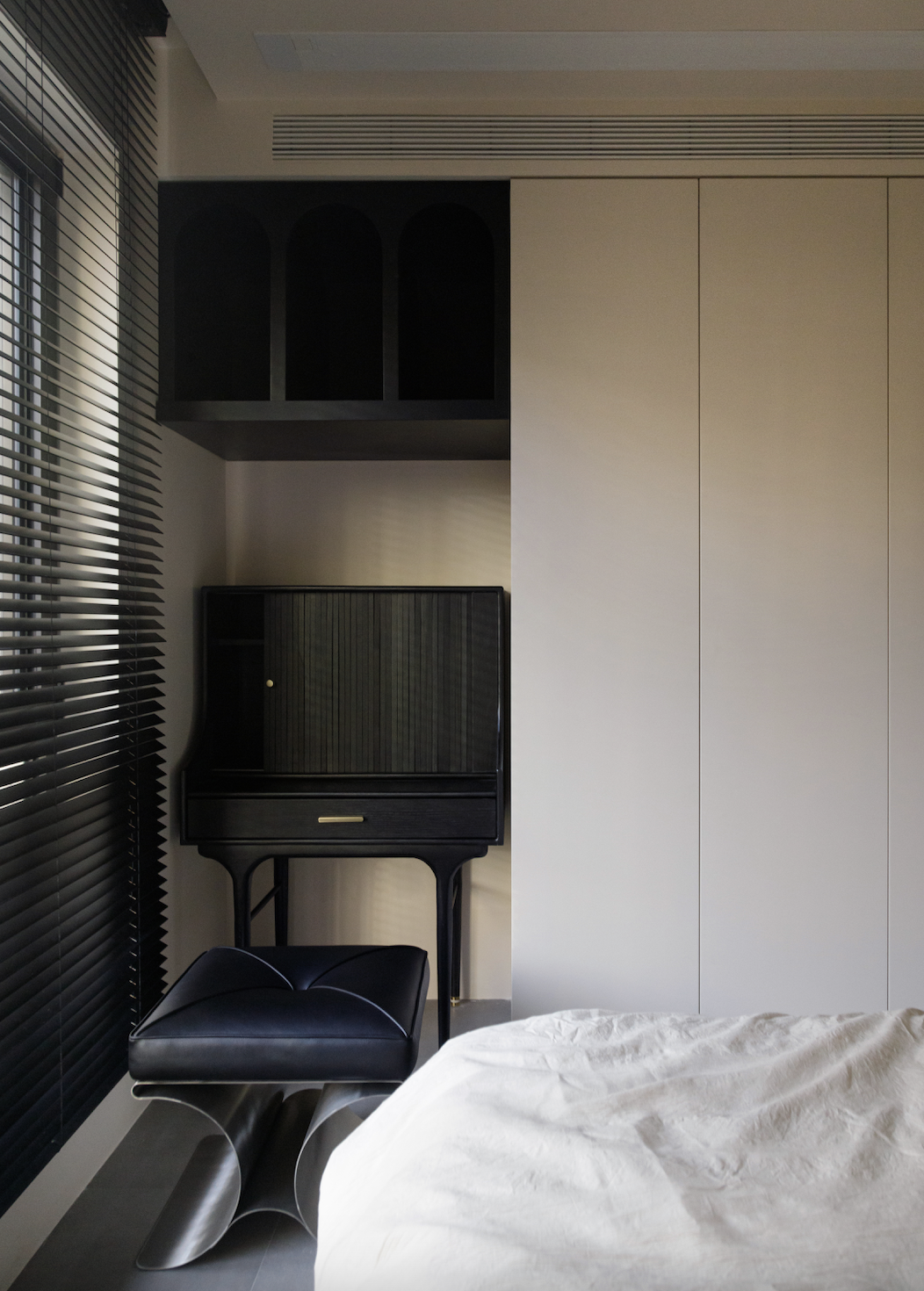 同樣延續了深淺結合的方式,弱化收納的繁雜,將生活的瑣碎全部收入櫃中,留下清爽乾淨的居室氛圍,溫和的暖光燈下,可以讓歸家的人卸下滿身疲憊,放鬆且自在…