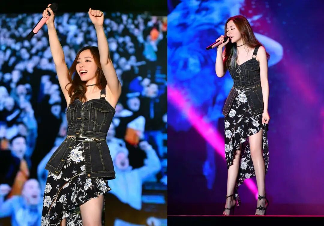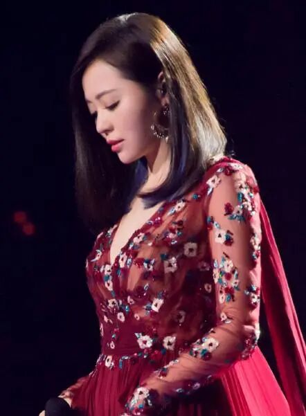 再來看張靚穎在另一場演唱會上的穿搭,一襲紅裙高貴冷豔,袖子採用的是半透明的紗網設計,再點綴了很多的碎花,看起來女王範十足,V字的設計凸顯了張靚穎的天鵝頸,也完美的修飾了她玲瓏的曲線,這身材還真是讓人羨慕,雖然這件衣服沒有剛剛那件華貴閃眼,但貌似更加適合靚穎。