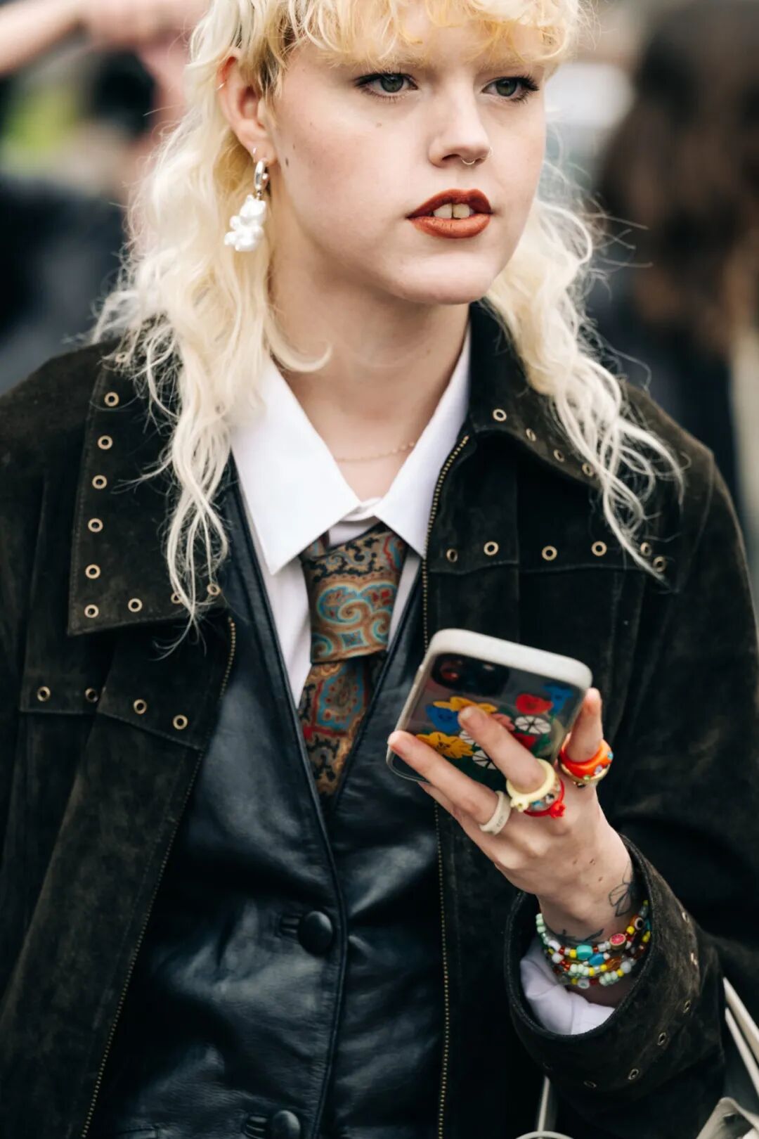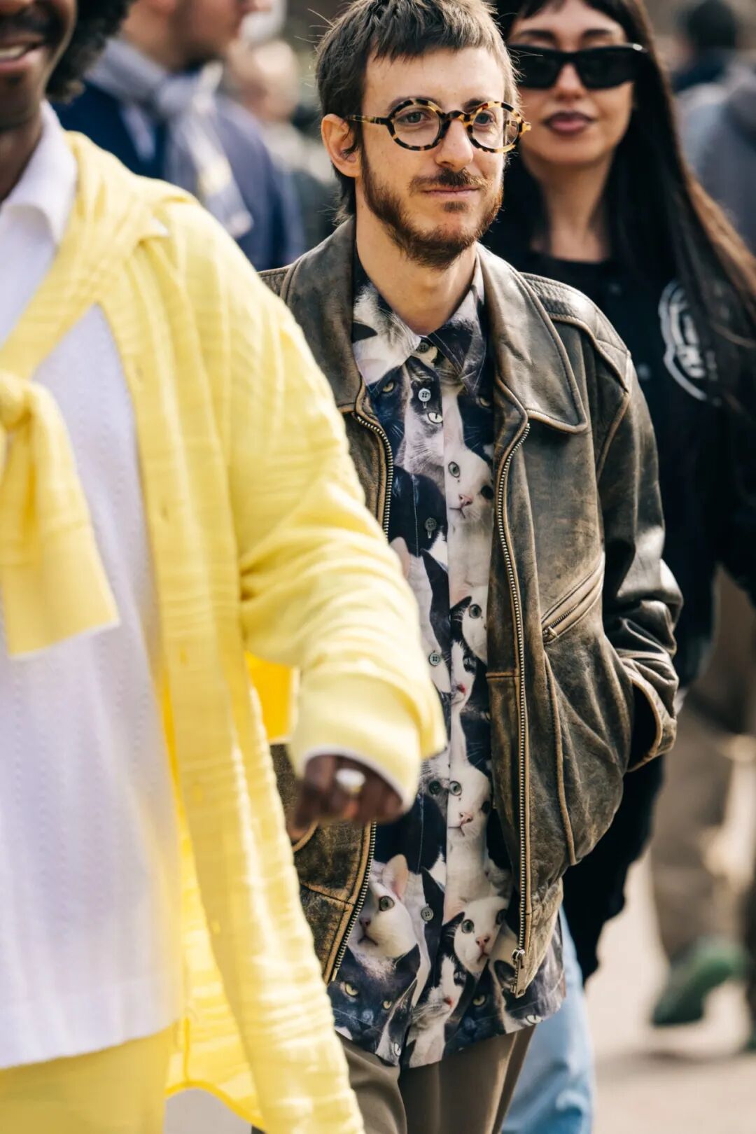 冷一點的地方內搭允許穿得厚一點,皮襯衫裡面有空間。這位在偏成熟的棕色皮襯衫裡面配件五顏六色的毛衣,沒想到這麼和諧呢!