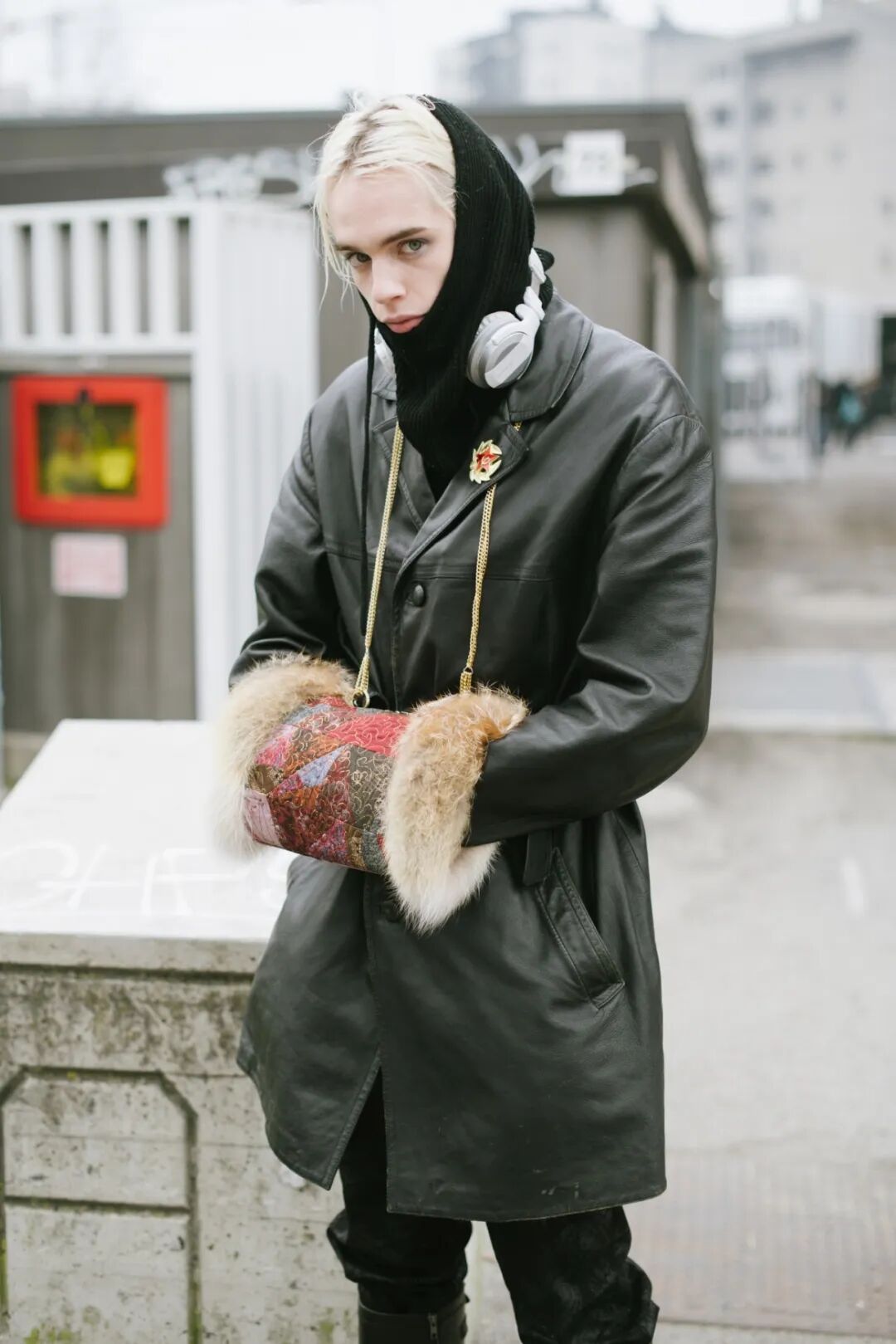 比如這位皮衣Boy(Or Girl)手裡的,不就是娘娘們人手一個的禦寒神器——暖手團麼?