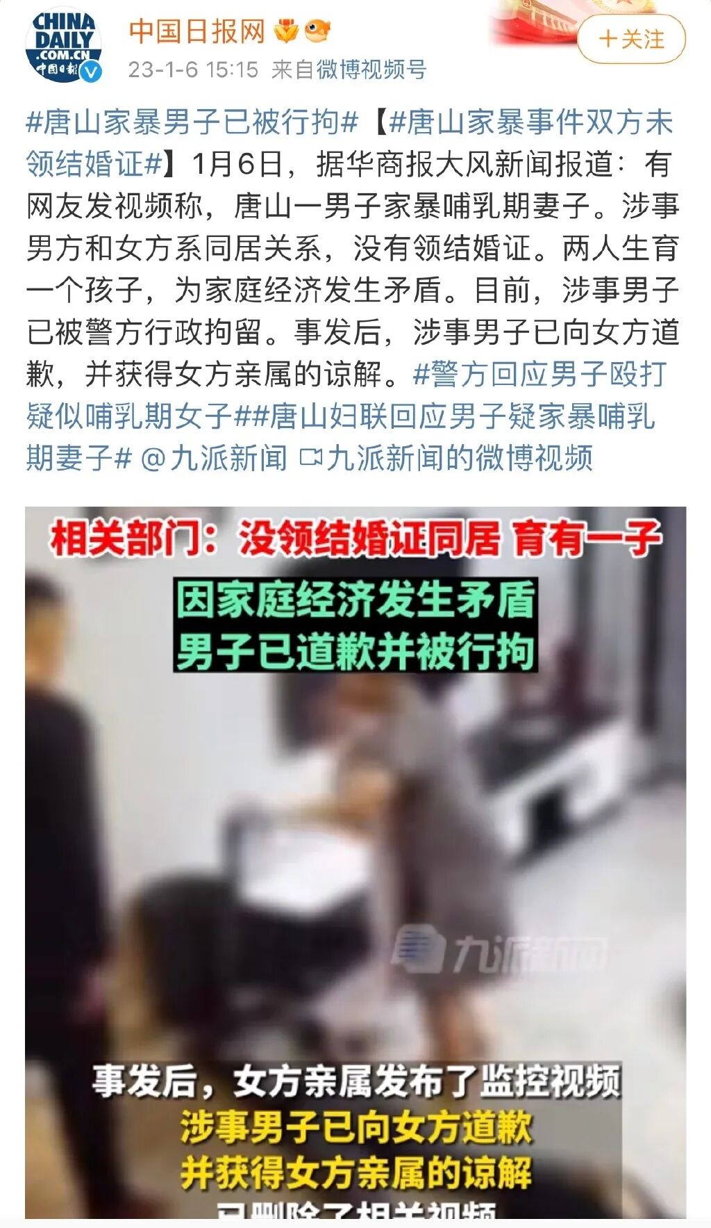 兩人是同居關係,未婚育有一子,男方已經道歉,取得了女方的原諒。
