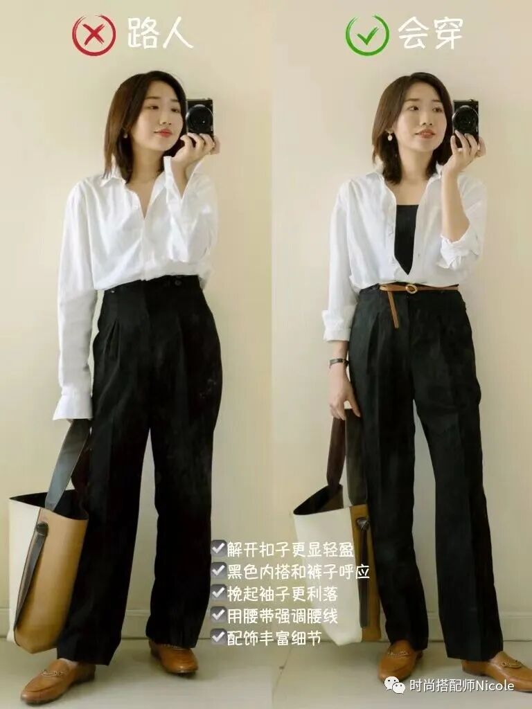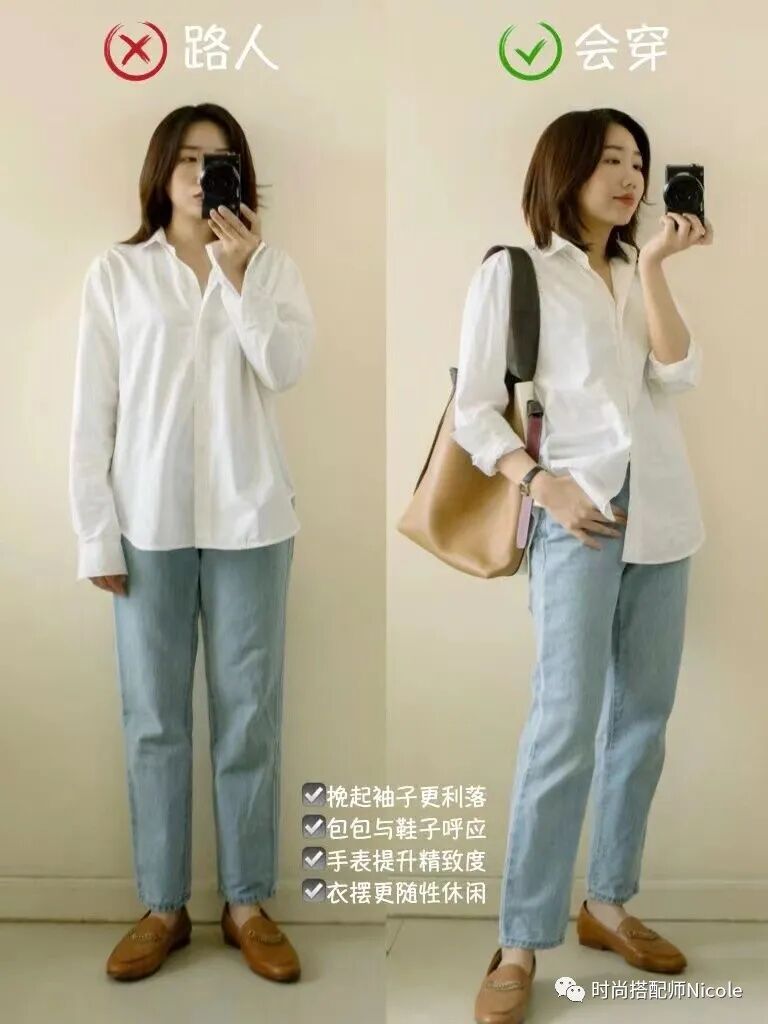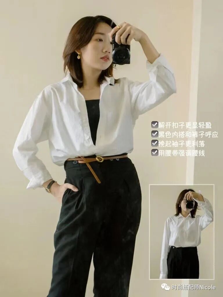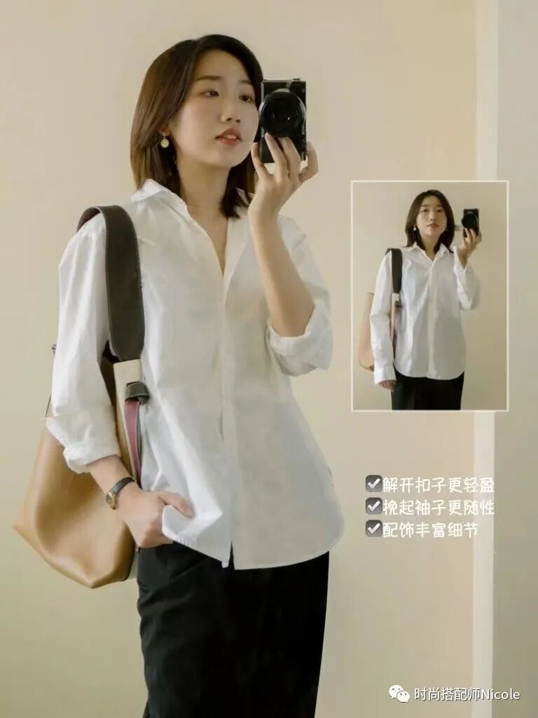 在基礎款穿搭裡,效果更明顯,一件白襯衫挽起袖子,幹練時髦利落的感覺通通有了,還無形中變得更合身了。