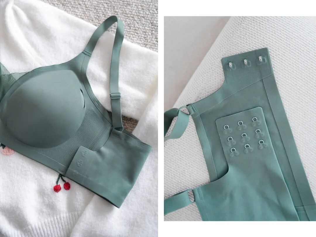 同樣用的是固定杯工藝,不怕機洗移位。背扣從標配三排三扣增加到四扣,胸圍放量再升級,大胸和小胸都能穿。而且有兩種款式可選,追求無感穿bra選背心式,像我大胸追求無痕微聚的,就可以選調節背扣式~