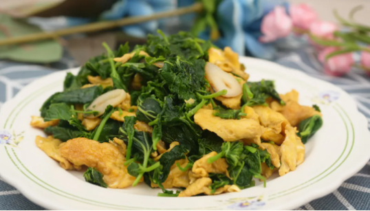 做法:新鮮桑葉焯水後擠幹水分,改刀成段;雞蛋打散,加鹽調味,攪拌均勻。鍋內倒油,下入蛋液,炒成形後先盛出。