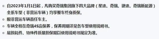 奇瑞汽車也在今年2月初宣佈,自2023年1月1日起,凡購買奇瑞集團旗下星途、奇瑞、捷途、奇瑞新能源四大品牌全系車型均可享受整車終身質保。據悉,奇瑞的終身質保協議限制條件包括:非營運首任車主、車輛全程在奇瑞4S店保養,此外還有一條是“針對易損耗件、特殊件質量擔保期以使用說明書規定為準,該項說明仍有少數零部件不在終身質保範圍”。也就是說,並非所有零配件都可以享受終身質保,還有“少數零部件”在保修範圍之外,至於這“少數”包括哪些,奇瑞並沒有公開明示。