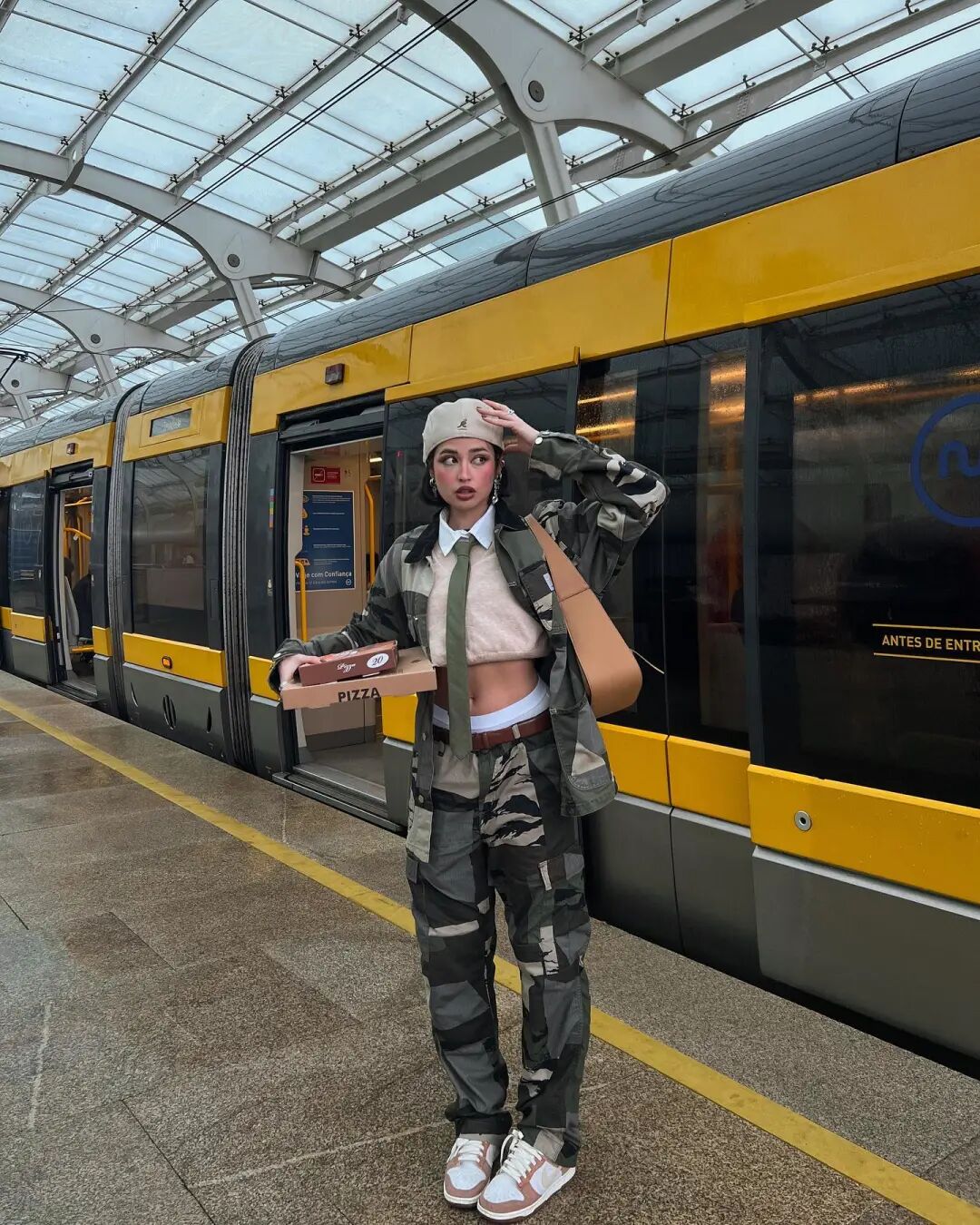 這套也是同樣的思路,緊身吊帶配低腰工裝褲,一秒夢迴2000s,迷彩不光只能穿在身上,手提迷彩包也超酷。